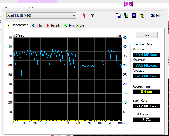 Der Massenspeicher in unserem ThinkPad 10 war identisch mit jenem des ThinkPad 8. Es handelt sich um ein 64 GB SanDisk eMMC Modell, das SEM64G, mit 58 GB verwendbarer Kapazität (die Kapazität kann wieder durch eine Micro-SD-Karte um bis zu 64 GB erweitert werden). Bei der eMMC-Lösung war der Kostenaspekt vordergründig und der Stromverbrauch zweitrangig. Wie vorherzusehen, ist die Leistung niedriger, um dies zu erreichen. Dementsprechend sind die durchschnittliche Transferrate in HD Tune von 67,3 MB/s und die sequentiellen Lese-/Schreib-Werte in CrystalDiskMark von 124,5 MB/s und 42,31 MB/s nicht zu beeindruckend.