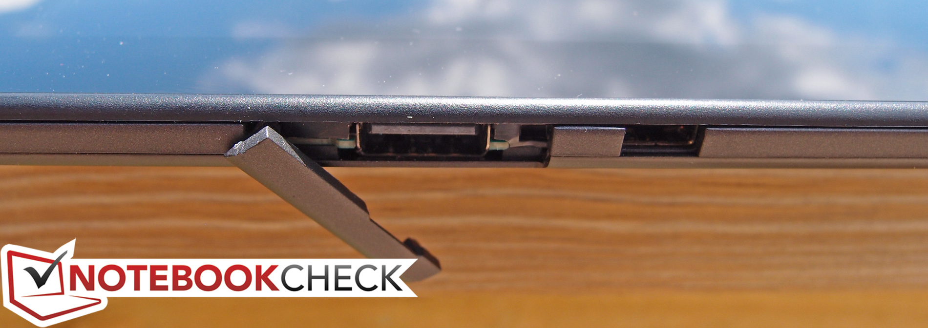 Die Schnittstellen befinden sich an der linken und rechten Seitenkante des Tablets und erfreulicherweise ist der Micro-HDMI-Port einfach erreichbar. Ein weiterer Nachteil des USB-2.0-Ports ist, dass er sich hinter einer lästigen Plastikabdeckung verbirgt, die einen schnellen Anschluss von Geräten unnötig erschwert. An der gegenüberliegenden Seite sind Micro-SIM- und MicroSD-Slot ebenfalls hinter einer Abdeckung versteckt. Diese werden jedoch wahrscheinlich weniger oft benötigt. Da sie über eine Abdeckung verfügen, kann Schäden an eingesteckten Karten vorgebeugt werden.