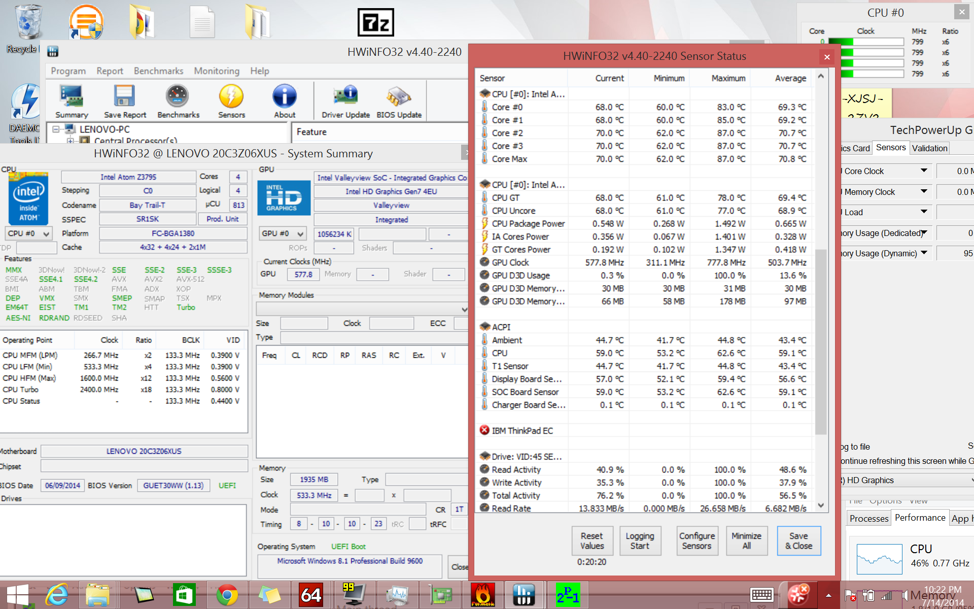 Das ThinkPad 10 bockt jedoch schnell unter Druck. Während des CPU-Stresstests (Prime95) fiel die Taktrate schrittweise von 2.266 MHz auf 1.500 MHz, danach auf 1.333 MHz und pendelte sich schließlich in einem Bereich von 933 und 1.199 MHz ein. Wird dem Tablet nur irgendeine Art von zusätzlichem Stress auferlegt, fällt die Taktrate weiter auf 799 MHz und ist von diesem Zeitpunkt an nur schwer zu beleben. Im GPU-Stress-Test ist die Angelegenheit noch schlechter (FurMark). Wir wurden Zeuge eines beinahe unmittelbaren Abfalls auf nur 311 MHz (Basis-Takt der GPU). Natürlich konnte das Gerät vollständigen Stress (CPU and GPU) überhaupt nicht bewältigen. Der GPU-Takt blieb permanent auf 311 GHz und der CPU-Takt auf dem Basistakt von 1,6 GHz - allerdings war die Nutzung nur 9% (wahrscheinlich wegen des jüngst eingebauten cTDP-Managements, welches eine laufende, aktive Anpassung des Stromverbrauchs der CPU an aktuelle Bedingungen ermöglicht). Es ist erwähnenswert, dass das Gerät in diesem Throttle-Zustand vollständig unbenutzbar ist. Die Auswirkungen des Stresstests sind in unseren Screenshots ersichtlich.