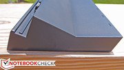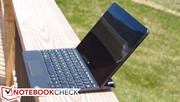 Es folgt die optionale Tastatur (120 US-Dollar, 526 g Gewicht), ein Zubehör, das wir bei unserem ThinkPad 8 Test schmerzlich vermissten. Sie bietet eine recht komfortable physikalische Tastatur und ein Touchpad (für mehr Details siehe Abschnitt Eingabegeräte). Wie das QuickShot-Cover, kann sie mühelos angeschlossen werden: Das Tablet muss nur auf den 120-Grad-gewinkelten Schlitz gelegt werden und durch Führungen an den richtigen Platz gelenkt werden. Leider löst es sich genauso leicht. Leicht unterliegt man der Versuchung, das Gehäuse wie bei einem konventionellen Notebook zu schließen. Doch den Deckel zu "schließen", ist nur auf eine einzige Art möglich: Tablet wieder aus dem Slot heben, verdeckt auf die Tastatur legen und nach hinten in den zweiten Satz von Führungen drücken, um das Tablet in dieser Position zu halten. Keinen Fehler machen: So konfiguriert, fällt das Tablet von der Basis und stürzt in sein Verderben, wenn man keine Vorsicht walten lässt. Letztlich ist der Winkel, in welchem das Tablet in der Basis gehalten wird, wegen des seltsamen Designs nicht veränderbar. Im Normalfall ist er brauchbar, doch in Anbetracht dessen, dass der Hochglanz-Bildschirm zu Spiegelungen neigt, kann das stören.
