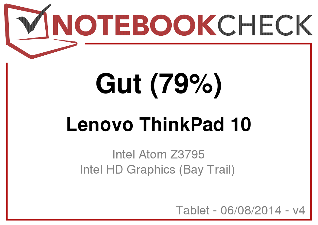 Als CPU fungiert der jüngste und beste Bay Trail Intel Atom Z3795 Quad-Core-SoC, welcher (gegenüber dem ThinkPad 8's Z3770) den Basis-Takt von 1,46 GHz auf bis zu 1,59 GHz (ein kleiner Unterschied) und die maximale Grafik-Burst-Frequenz von 667 MHz auf 778 MHz erhöht - unter der Voraussetzung, dass thermischer Spielraum vorhanden ist. Die CPU-Burst-Frequenz bleibt bei 2,39 GHz. Natürlich ist das Gesamtpaket durch seine SDP von nur 2 Watt stark eingeschränkt. Daher ist es unwahrscheinlich, dass es zwischen dem ThinkPad 8 und dem ThinkPad 10 zu einer deutlichen Leistungssteigerung kommt.