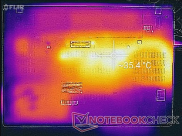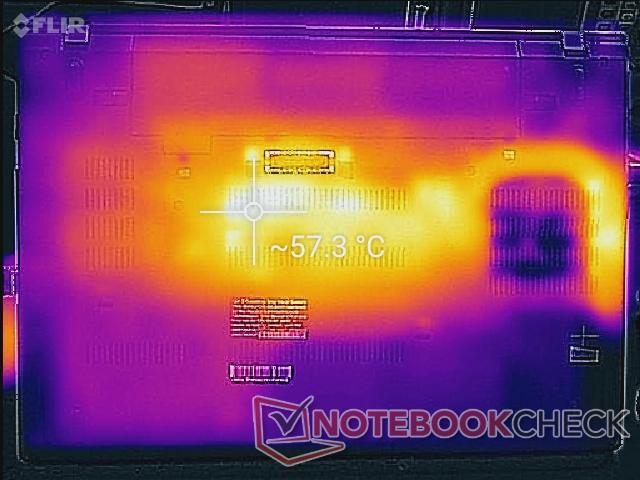 Im Leerlauf sind die Temperaturen auf der Oberseite recht gering, allerdings erkennt man stets die Hotspots im Bereich der Heatpipes auf der Unterseite. Unter Last (Spielen, Stresstest) messen wir an diesen Stellen bis zu 57 °C, was auf den Oberschenkeln sehr unangenehm werden kann. Zudem blockiert man dann auch schnell den Lüfterauslass auf der linken Seite. Bei hoher Last sollte man den Laptop daher nach Möglichkeit auf einem Schreibtisch nutzen. Es gibt keine großen Unterschiede zwischen der linken und rechten Seite der Tastatur & Handballenauflage, die mit ~40 °c allerdings recht warm werden.