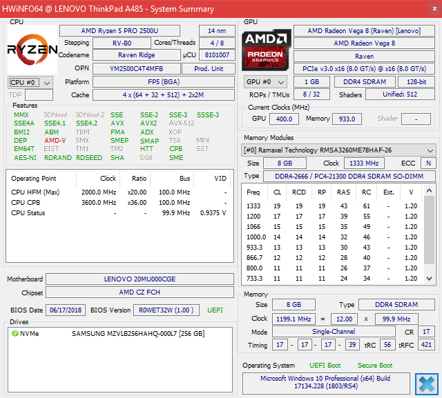Auf dem deutschen Markt verkauft Lenovo aktuell ein einziges Modell des ThinkPad A485, das wir auch testen. Dieses enthält den AMD Ryzen 5 Pro 2500U, die integrierte GPU AMD Radeon RX Vega 8, ein 8 GB DDR4-RAM-Modul (einer von zwei Slots belegt, maximal 32 GB) sowie das Full-HD-IPS-Display und eine 256-GB-SSD. Möchte man das A485 mit anderen Komponenten erwerben, ist das nur über den Lenovo-eigenen Shop möglich. Im Konfigurator gibt es weitere CPU-Optionen wie den AMD Ryzen 3 2300U und den Ryzen 7 Pro 2700U, mehr Arbeitsspeicher und SSD-Speicher und auch weitere Display-Optionen.