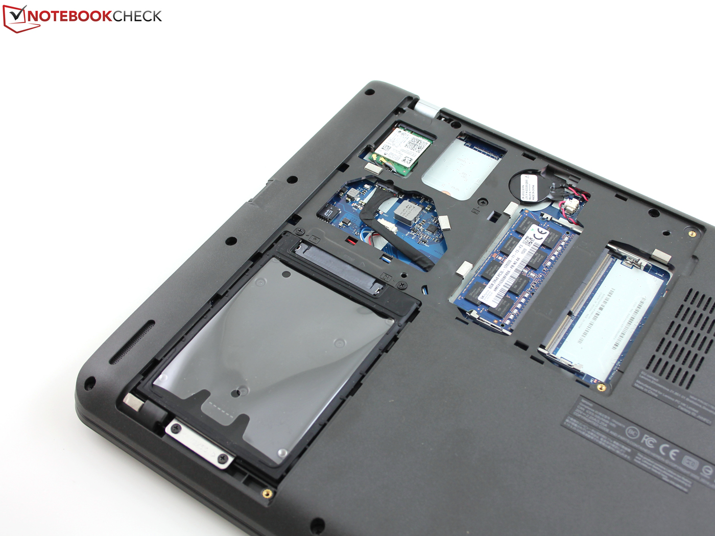 An der Unterseite des Gerätes befindet sich eine Wartungsklappe, die einen Zugriff auf die wichtigsten Hardware-Komponenten gestattet. Dazu gehören Festplatte (2,5 Zoll, 7 Millimeter), WLAN-Modul und Arbeitsspeicher (1 von 2 Slots belegt). Der Gehäuselüfter bleibt leider außen vor, ebenso der Akku, der ist fest verbaut. Siehe Foto, Lötpunkte auf dem Mainboard zeigen die Vorbereitung für einen M.2-Slot – womöglich könnte es in Zukunft Konfigurationen mit Mobilfunk-Adapter oder M.2-SSD geben.