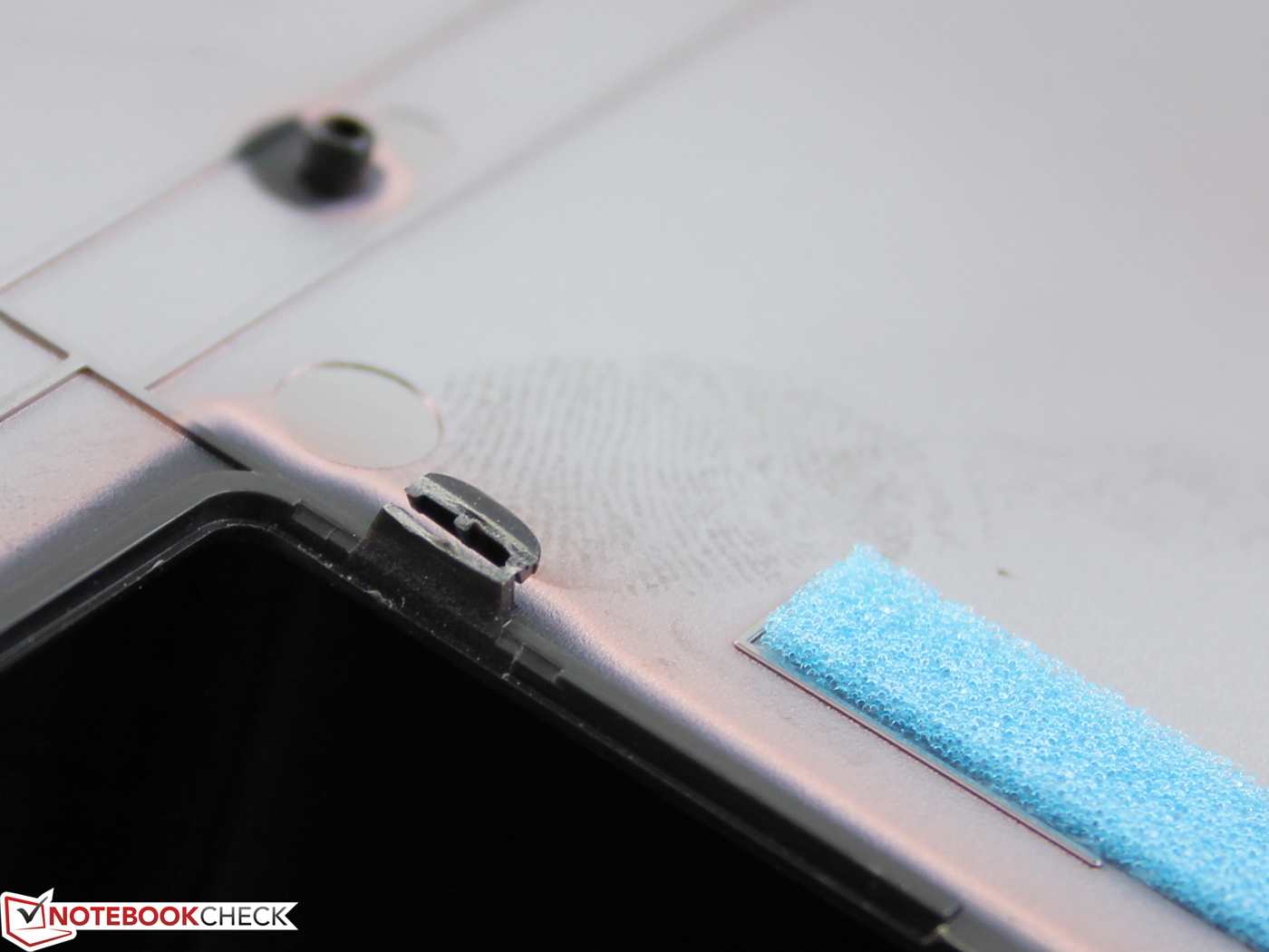 Der Deckel ist mäßig verwindungsfest, die Rückseite widersteht leichtem Druck aber ziemlich gut. Verwinde-Versuche quittiert das Panel mit Aufhellungen an den Rändern.