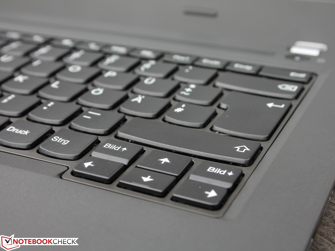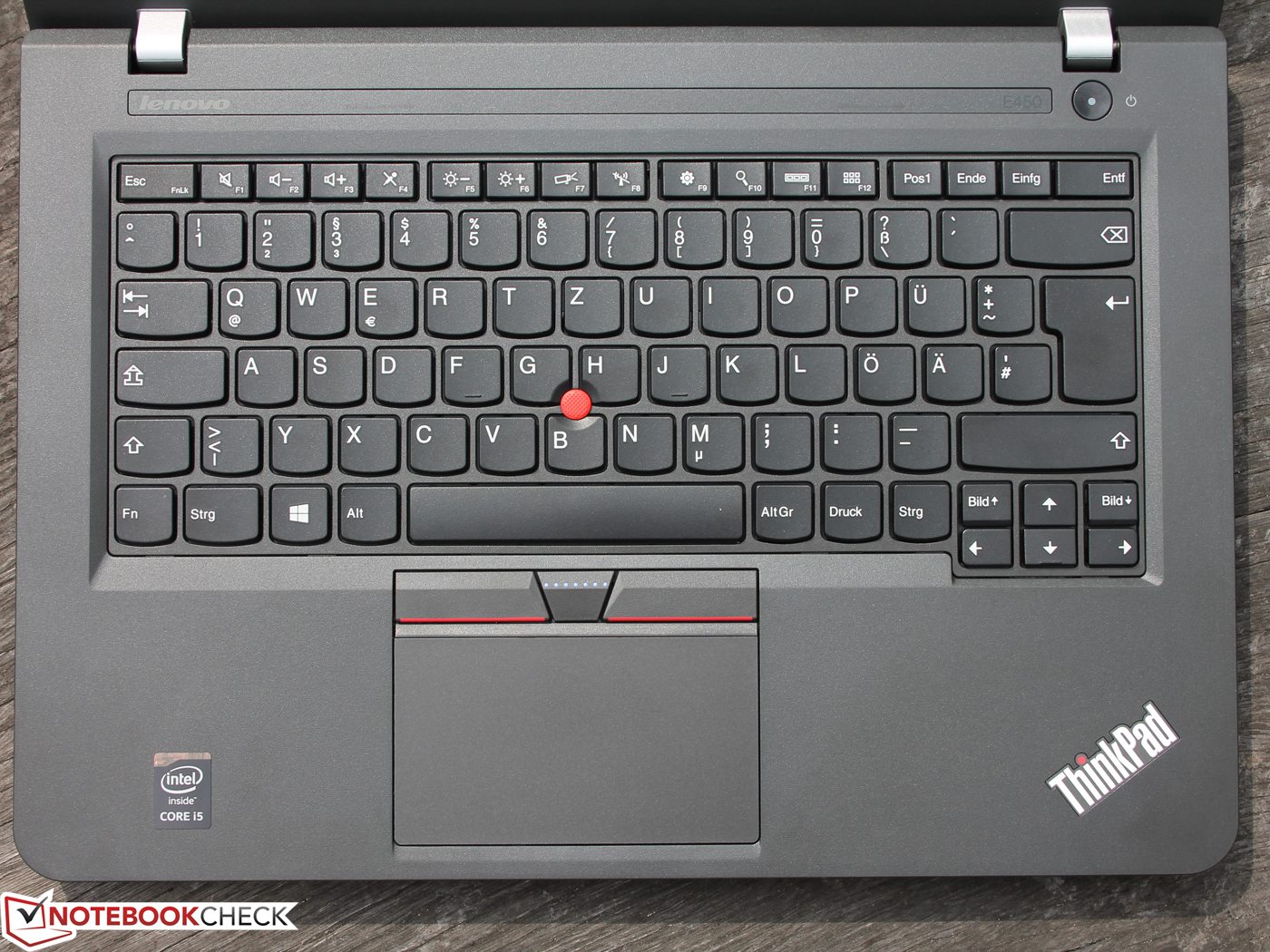 In puncto Qualität, Optik und Layout unterscheidet sich die Tastatur des E450 nicht von höherpreisigen ThinkPads wie dem T450s. Es gibt aber Unterschiede: Unser Testmodell hat keine Hintergrundbeleuchtung. Zudem ist das Schreibgefühl ein anderes und reicht nicht ganz an die teureren Schwestermodelle heran. So glänzt auch unser E450 mit seinem langhubigen und festen Anschlag. Das satte, mechanische Feedback der T-Serie wiederholt sich allerdings nicht, was durch ein Klappern beim schnellen Tippen deutlich wird. Die Kritik äußern wir aber auf hohem Niveau, im Vergleich mit der direkten Konkurrenz hinterlässt das Keyboard einen fast tadellosen Eindruck. Einziges echtes Manko ist nicht etwa der fehlende Ziffernblock, dafür ist ein 14-Zoller einfach zu klein. Nein, in der Mitte federt die Tastatur beim energischen Tippen ein klein wenig. Der ansonsten feste Anschlag wird dadurch geschmälert. So oder so, hohe Schreibgeschwindigkeiten sind mit dieser Tastatur möglich, sie eignet sich sehr gut für ambitionierte Vielschreiber.