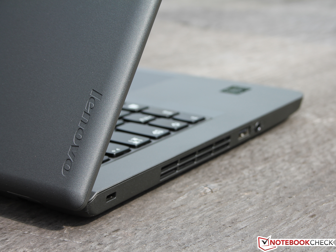 Obwohl das E450 keinen regulären Docking-Anschluss besitzt, ist die gezeigte Ausstattung dennoch erweiterbar. Hierfür hat Lenovo einen speziellen Netzteil-Anschluss vorgesehen, der sich mit den sogenannten OneLink Docks – einer kleinen Box, die neben das Notebook gestellt wird – verbinden lässt. Die im Bild sichtbare Abdeckung direkt neben dem Netzanschluss muss nur entfernt werden, darunter liegt der mit dem Stromanschluss kombinierte OneLink. Das Netzteil wird dann nicht mehr ans Notebook, sondern an das Dock angeschlossen. Die ab etwa 130 Euro erhältliche Pro-Version wartet sogar mit DisplayPort auf.