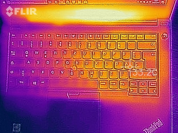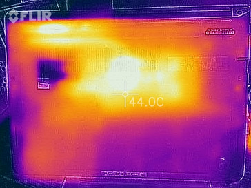 Die verbauten Komponenten stellen für das Kühlsystem keine Herausforderung dar. Das wird nicht nur durch die geringe Geräuschkulisse deutlich, sondern auch durch die geringe Temperaturentwicklung. Selbst unter Last erreicht das Gehäuse maximal 37 °C (44 °C an einem Hotspot am Lüfterauslass). Bei den Temperaturen fällt das E470 ohne GeForce GPU eindeutig in die Kategorie "unbedenklich", das andere Modell wurde deutlich wärmer.