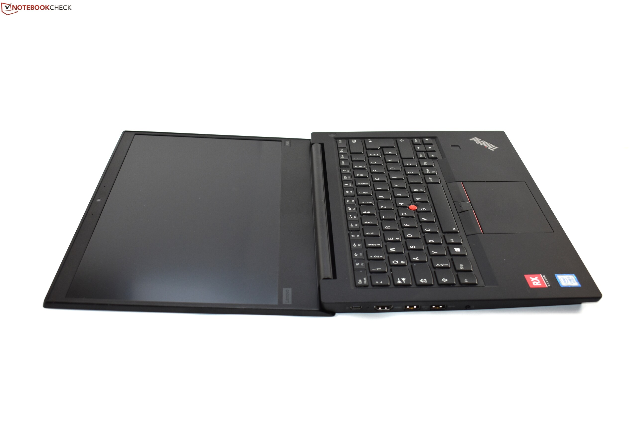 Das breite Mono-Scharnier kennen wir schon vom ThinkPad E470. Beim E480 ist es sehr gut eingestellt, denn das Öffnen des Displays mit einer Hand ist möglich und das Display wackelt dennoch kaum nach. Früher ließen sich die Displays der ThinkPad-E-Serie nur auf bis zu 135° öffnen, doch das Mono-Scharnier erlaubt beim E480 den ThinkPad-typischen Öffnungswinkel von 180°.