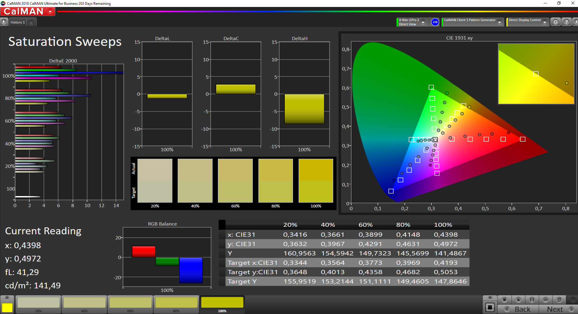 | Delta E Graustufen * | 2.3 | 6.4 -178% | 4.5 -96% | 2.7 -17% | 3.8 -65% | 3.15 -37% | 3.5 -52% | 2.29 -0% |