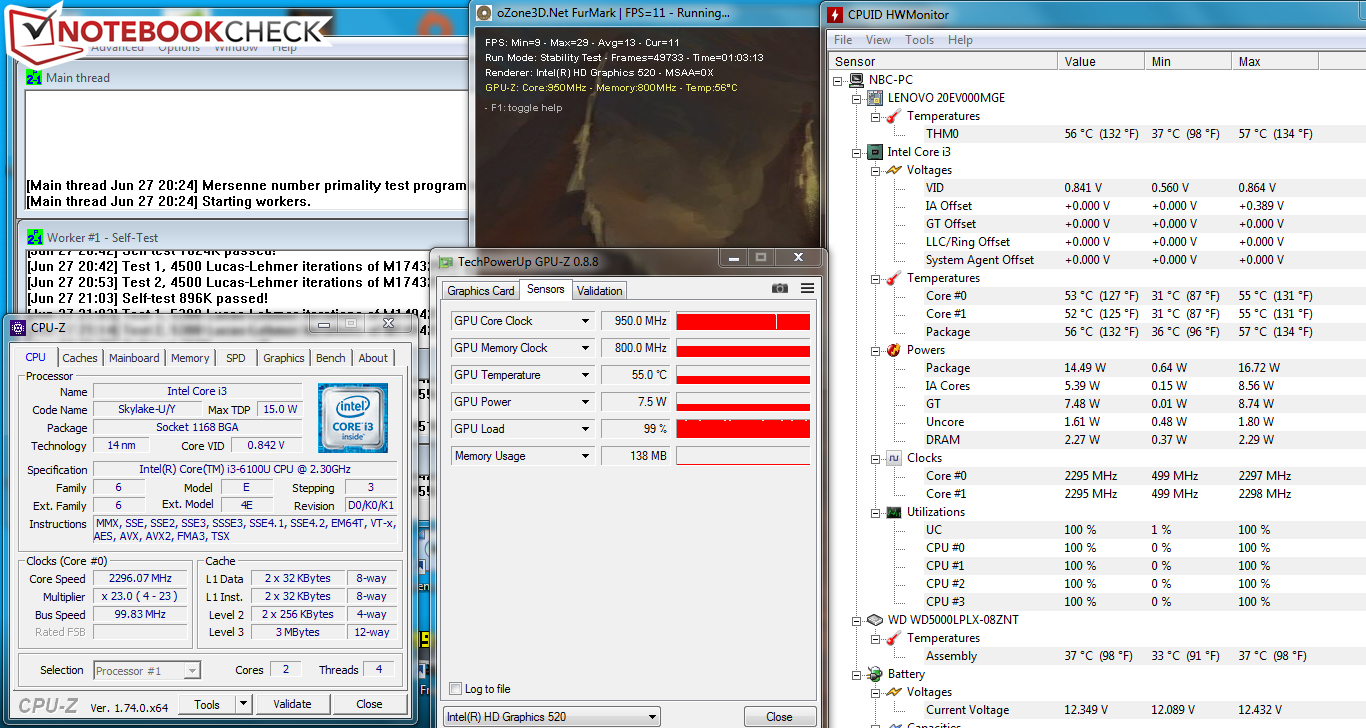 Unseren Stresstest (Prime95 und Furmark laufen für mindestens eine Stunde) bearbeitet das Thinkpad im Netz- und Akkubetrieb auf leicht unterschiedliche Weisen. Der Prozessor werkelt immer mit voller Kraft (2,3 GHz). Der Grafikkern arbeitet mit 450 MHz (Akkubetrieb) bzw. 950 MHz (Netzbetrieb). Von einer wirklichen Erwärmung kann beim Thinkpad nicht gesprochen werden. Während des Stresstests (Netzbetrieb) liegen die Temperaturen an allen Messpunkten deutlich unterhalb von 30 Grad Celsius.