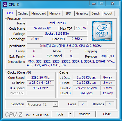 Das Thinkpad ist mit einem Intel Core i3-6100U (Skylake) Zweikernprozessor ausgestattet. Es handelt sich hier um ein sparsames ULV-Modell, das eine TDP von 15 Watt besitzt. Die CPU bietet mehr als genügend Rechenleistung für Anwendungen aus den Bereichen Office und Internet. Die CPU arbeitet mit einer Basisgeschwindigkeit von 2,3 GHz. Im Gegensatz zu den Core-i5- und Core-i7-Modellen besitzt der Core i3 keinen Turbo. Allerdings unterstützt er Hyperthreading (pro Kern können zwei Threads bearbeitet werden). Die volle Rechenleistung steht im Netzbetrieb zur Verfügung. Im Akkubetrieb geht die CPU mit 2 GHz (Single-Thread) bzw. 1,4 GHz (Multi-Thread) zu Werke.