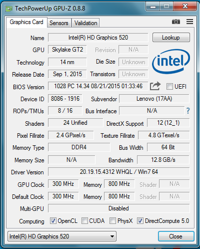 Höherpreisige Thinkpad-E560-Modelle sind mit Radeon R7 M370 Grafikkernen zu bekommen. Unser Testgerät ist nur mit Intels HD Graphics 520 GPU bestückt. Der Grafikkern unterstützt DirectX 12 und arbeitet mit Geschwindigkeiten von bis zu 950 MHz. Die Resultate in den 3D Mark Benchmarks bewegen sich auf einem normalen Niveau für diese GPU. Die Resultate können durch den Einbau eines zweiten Arbeitsspeichermoduls noch gesteigert werden. Der Arbeitsspeicher läuft dann im Dual-Channel-Modus, wodurch die GPU besser ausgereizt wird und höhere Ergebnisse liefert.
