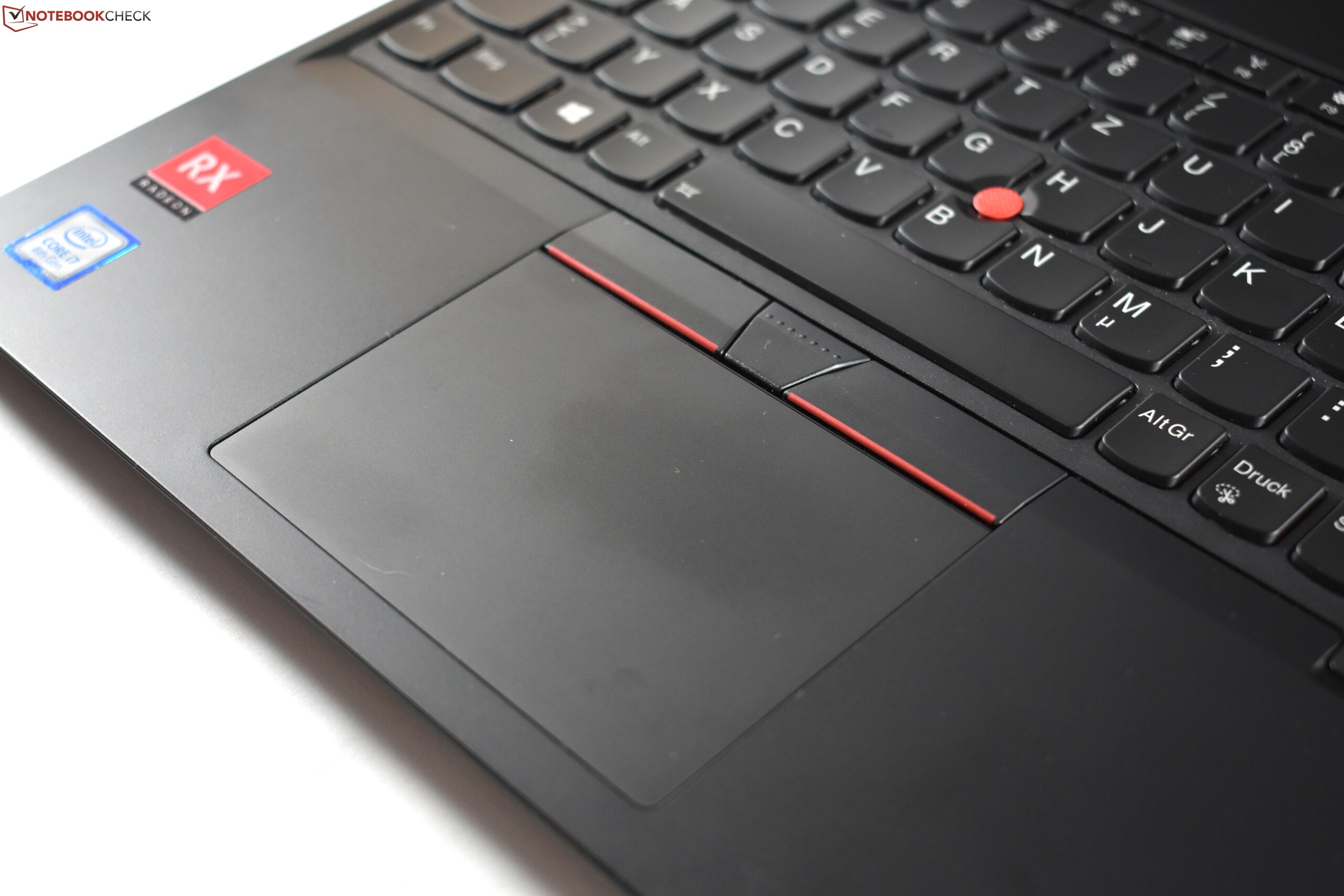 Die Maustasten oberhalb des Touchpads sind dem roten TrackPoint zugeordnet, der wie immer zwischen den B/G/H-Tasten sitzt. Der typische ThinkPad-TrackPoint lässt sich sehr angenehm bedienen und ist ein guter Mausersatz, da man den Mauscursor schnell und präzise kontrollieren kann, ohne die Hände von der Tastatur zu nehmen.