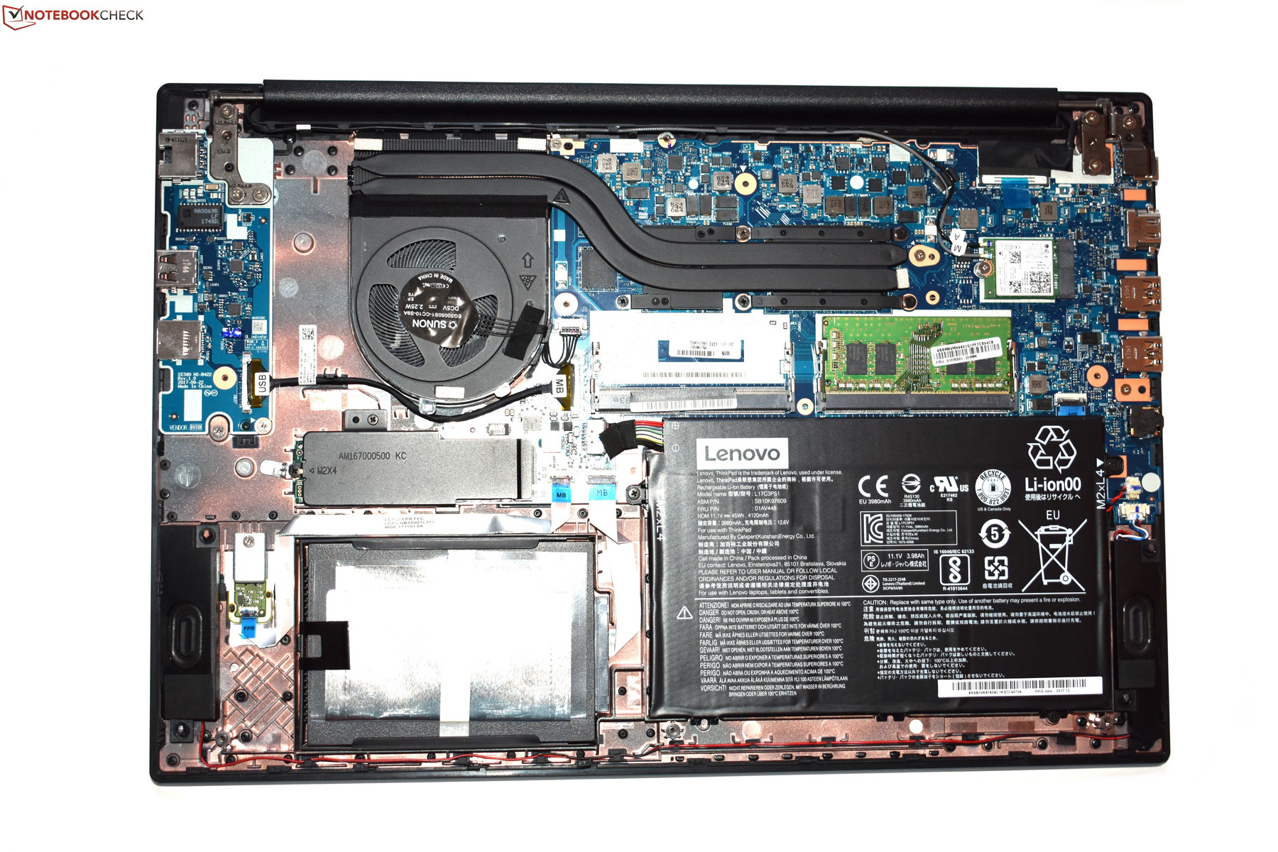 Der innere Aufbau des E580 entspricht dem E480 fast komplett. Den zusätzliche Raum des 15-Zoll-Gehäuses nutzt der Hersteller nicht aus, weshalb es auch einige Leerstellen gibt – diesen Raum hätte man für ein stärkeres Kühlsystem oder einen größeren Akku nutzen können. Während die Raumausnutzung also schlecht ist, können wir bei der Erweiterbarkeit nicht viel bemängeln: Es gibt zwei RAM-Slots (einer frei), den 2280-M.2-Steckplatz sowie einen 2,5-Zoll-Slot für Festplatten oder SSDs, der in diesem Fall mit einem Dummy bestückt ist. Sehr wichtig ist natürlich auch der Zugang zum Akku und zum Lüfter. Zudem kann man als Nutzer die Tastatur des E580 sehr einfach austauschen.