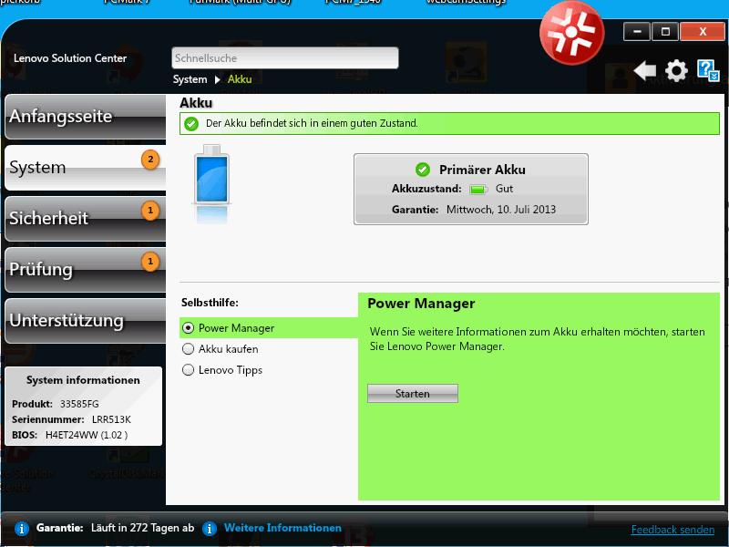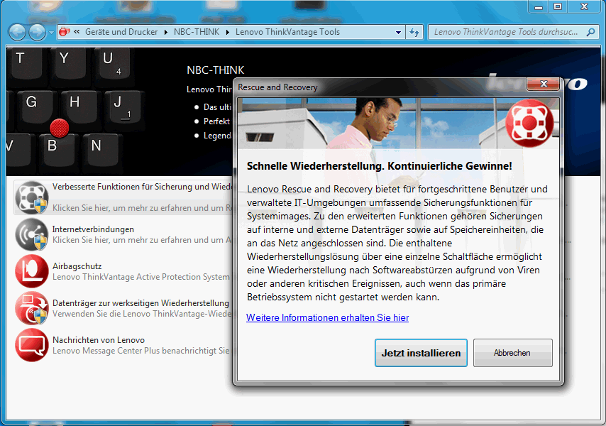 Lenovo spielt die ThinkVantage Tools auf. Hier finden sich gebündelt alle Programme und Tools bezüglich Recovery, Sicherung, Festplattenschutz (Sensor für Erschütterungen), Treiber-Updates und Energiesteuerung. Hinzu kommt die Webcam-Steuerung, welche Kamera und Mikrofon für Videokonferenzen optimiert. Die meisten Settings wären auch über die Windows Systemsteuerung möglich, die Bündelung an einem Ort ist aber sehr hilfreich.