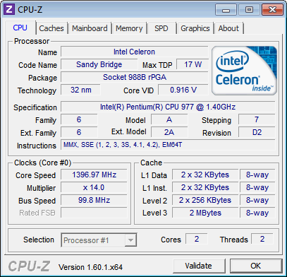 Den Edge E130 gibt es aktuell in zwei CPU-Versionen: Der Pentium 977 (im Testgerät) als Einsteigermodell (ab 390 Euro) und der Core i3 2367M als Premium-Modell ab 540 Euro. Der Pentium 977 hat zwei Kerne mit 1,4 GHz Taktung. Die 17-Watt-CPU aus der Sandy-Bridge-Architektur (2010-2011) wirkt etwas altbacken, da selbige Mitte 2012 von Ivy Bridge abgelöst wurde. Turbo Boost und HyperThreading sind Fremdworte für den Pentium, so aber auch für den alternativen Core i3 2367M. Im Folgenden werden wir bewerten, ob das Leistungsplus des i3 den hohen Aufpreis wert ist.