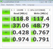 Im Detail fällt die relativ kurze Zugriffszeit (17,8 ms) auf. Beim 4K-Read befindet sich die HDD jedoch wieder im Mittelfeld aller Festplatten. Eine SSD könnte den 4K-Wert problemlos auf 2243 % anheben (siehe Toshiba Z830-10N, i3 2367M), was die erlebte Arbeitsgeschwindigkeit deutlich steigert.