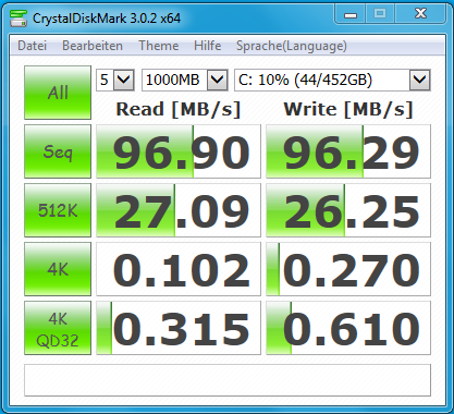 In unserem Testgerät werkelt eine Festplatte aus der Travelstar-Z5K500-Serie von Hitachi. Sie besitzt eine Kapazität von 500 GB und arbeitet mit 5.400 Umdrehungen pro Minute. CrystalDiskMark meldet eine Lesegeschwindigkeit von 96,9 MB/s. HD Tune liefert eine durchschnittliche Transferrate von 77,3 MB/s. Diese Werte gehen bei einer 5.400er-Festplatte in Ordnung. Etwas zu hoch fällt die Zugriffszeit mit 22,1 ms aus. Auch die 4k-read/write-Resultate können nicht überzeugen. Viele vergleichbare Festplatten liefern bessere Werte. Relevant sind diese Werte, da die meisten Daten in Blöcken mit einer Größe von 4 kb abgelegt werden. Das Edge E135 konnte noch mit einer deutlich schnelleren 7.200er-Festplatte aufwarten. Ein solches Modell hätten wir auch beim E145 erwartet.