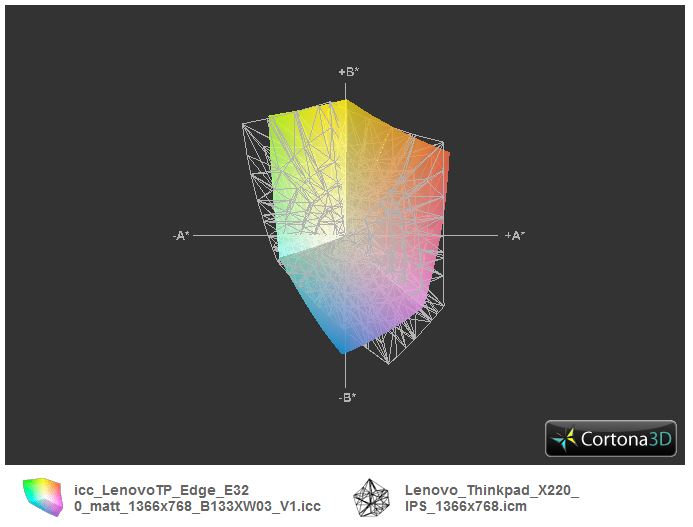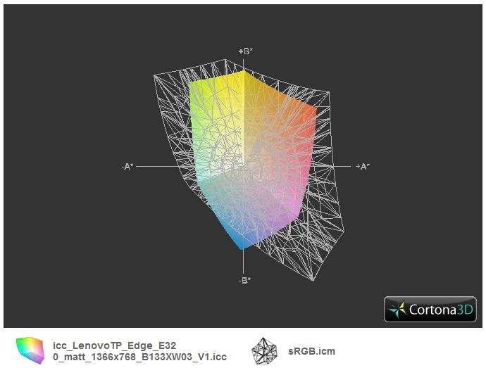 Die matte Oberfläche ist nicht der Grund für die schwachen Kontraste. Ein Glare Type würde die Farben optisch mit einer gewissen Brillanz versehen, der Schwarzwert (0.93 cd/m²) wäre derselbe. Der Farbraum des AUO-Panels liegt deutlich unterhalb sRGB (Bild Mitte), das heißt es kann die Farben dieses Spektrums nicht vollständig abbilden. Der Farbraum ist jedoch nur für Profi-Bildbearbeiter relevant, weshalb nur teure Ausnahme 13.3-Zoller in dieser Hinsicht besser sind (Samsung 900X3A, Vaio Z13Z9E). Selbst das oft gelobte IPS-Panel (sehr gute Blickwinkel) im ThinkPad X220 hat nur einen geringfügig breiteren Farbraum und deckt sRGB nicht ab.