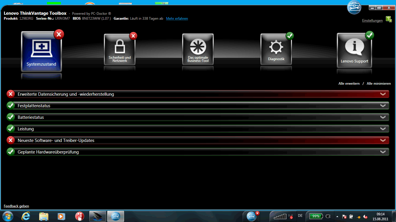 Business-Eigenschaften, wie Fingerabdruckleser, Computrace Diebstahlsicherung, spritzwassergeschützte Tastatur sind nicht an Bord. Immerhin gibt es aber den APS-Sensor (Bewegungssensor für Festplatte, Parkposition bei Erschütterung) und den Kensington Security Lock. Die ThinkVantage-Tools bündeln die Sicherheits-, Energie- und Systemeinstellungen. Auch die Datensicherung und Wiederherstellung erfolgen von diesem zentralen Tool aus.