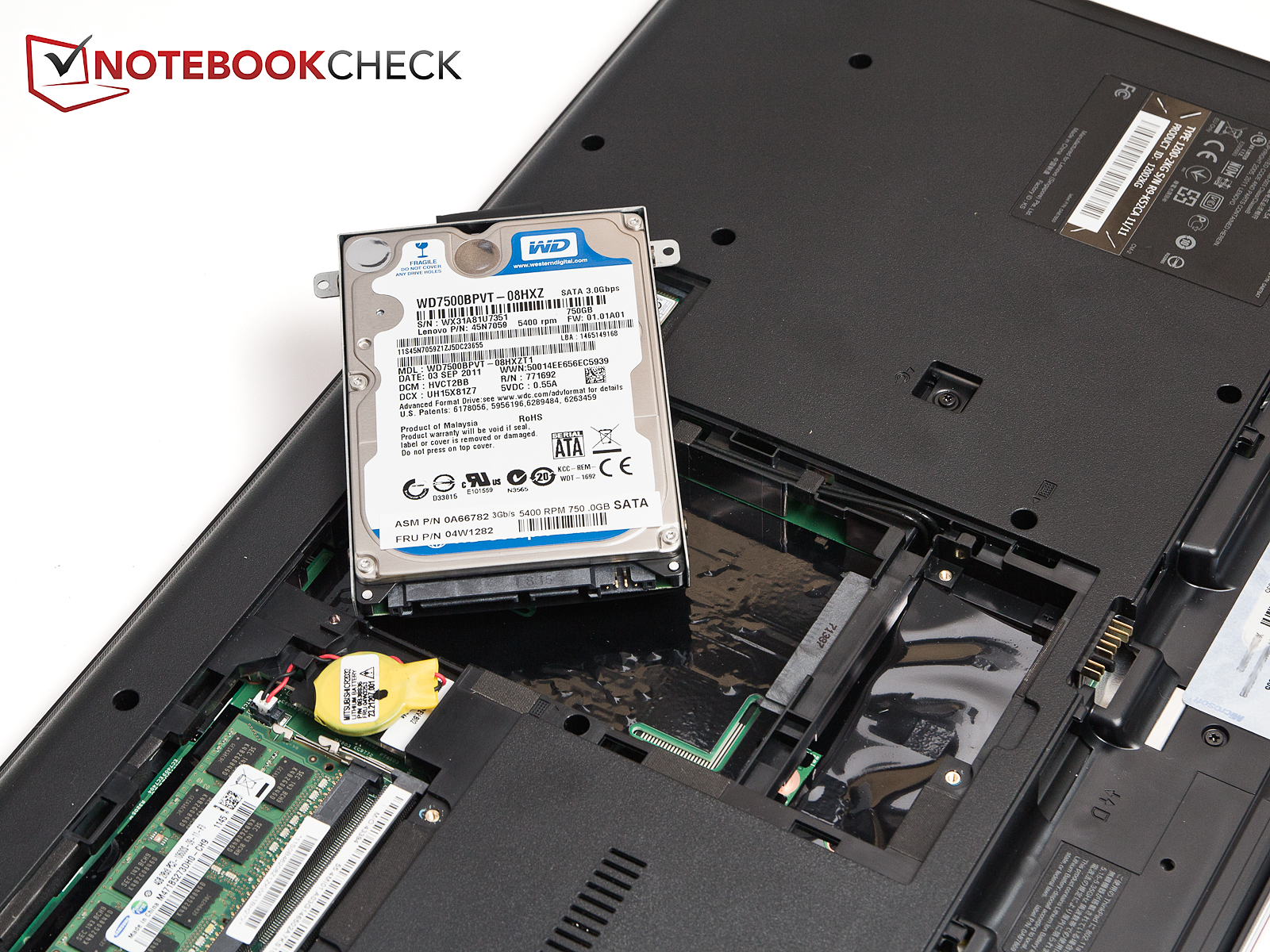 Über die T-förmige Wartungsöffnung an der Unterseite lassen sich problemlos die per SATA angeschlossene 2.5-Zoll-Festplatte und die beiden Arbeitsspeichermodule erreichen. So ist das Aufrüsten des Arbeitsspeichers und des Festplattenspeichers kein Problem. Von den beiden Arbeitsspeichermodulen ist in unserem Testgerät noch eines unbenutzt. Auf das Kühlsystem erhält man keinen Zugriff per Wartungsklappe, was das Reinigen von Lüftern und Kühlern erheblich erschwert (Garantieanspruch?), sollten diese mal stark verschmutzt sein.
