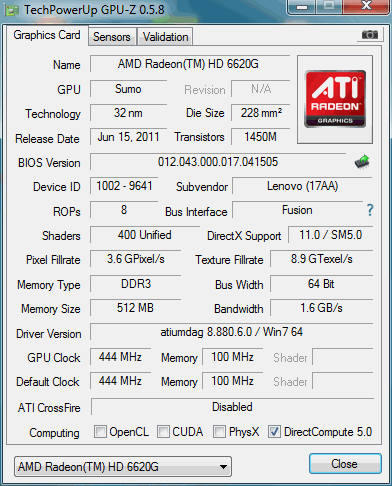 Bei der im Prozessor integrierten Grafikkarte handelt es sich um die AMD Radeon 6620G. Es ist die schnellste integrierte Grafik, die AMD in den Prozessoren zu bieten hat. Die Grafikkarte besitzt 400 Shaderkerne, muss allerdings auf den Hauptspeicher zurückgreifen, da kein dedizierter Speicher eingeplant wurde. Leistungstechnisch liegt die Grafikkarte auf dem Niveau einer Mobility Radeon HD 5650 Mittelklasse-Grafikkarte. Verglichen mit den integrierten Grafikkarten von Intel dürfte die AMD Radeon 6620G aber deutlich vor der Intel HD Graphics 3000 Grafikkarte liegen. Um eine Grafikkarte für Spiele handelt es sich bei der 6620G trotzdem nicht, etwas betagtere Titel sollten sich aber flüssig wiedergeben lassen.