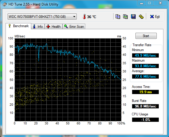 Bei der verbauten WDC WD7500BPVT-08HXZT1 Festplatte handelt es sich um ein 2.5-Zoll-Modell mit einer Geschwindigkeit von 5.400 U/min. Mit einer (Brutto-) Kapazität von 750 GB sollte sie genügend Raum für die meisten anfallenden Daten bieten. Geht man davon aus, dass auf einem Office-Notebook wie dem ThinkPad Edge E525 eher weniger Videos und Fotos gespeichert werden, dürfte der Festplattenplatz lange ausreichen. In Anbetracht der gelieferten Leistung unterscheidet sich die Festplatte kaum von den Festplatten, die in den meisten anderen Notebooks eingesetzt werden. Bezogen auf die von HD Tune ermittelten Daten, liegen die durchschnittliche und die minimale Transferrate knapp über dem Durchschnitt. Die Zugriffszeit von 19.9 Millisekunden ist nicht übermäßig schnell, aber hält sich noch im Rahmen.