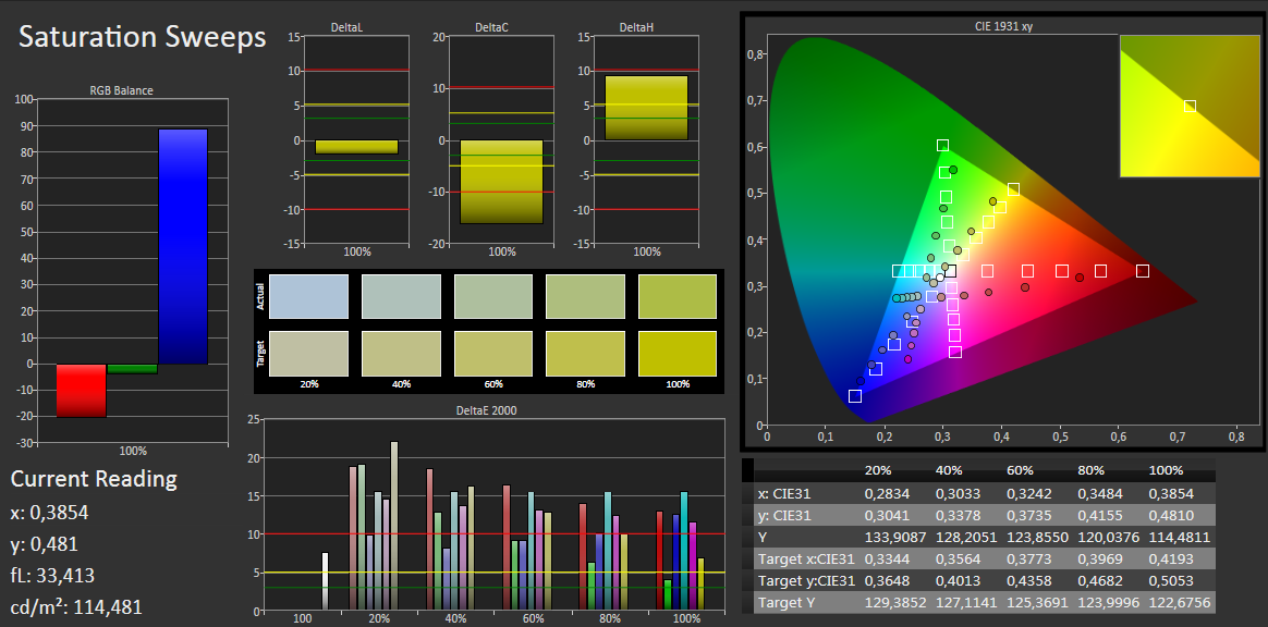 Große Farbräume sind vor allem für (semi-)professionelle Bildbearbeiter wichtig, die sich deshalb nicht für das E540 entscheiden sollten. Selbst der kleine sRGB-Farbraum wird nicht ansatzweise abgedeckt, vom größeren AdobeRGB-Farbraum ganz zu schweigen, dessen Farbumfang das Display nur zu 35 % abbilden kann. Ebenfalls zu wünschen übrig lässt die Farbtreue. Sowohl ColorChecker als auch Greyscale weisen einen durchschnittlichen DeltaE-Wert von über 12 aus, was sich wieder einmal in einem deutlichen Blaustich niederschlägt.