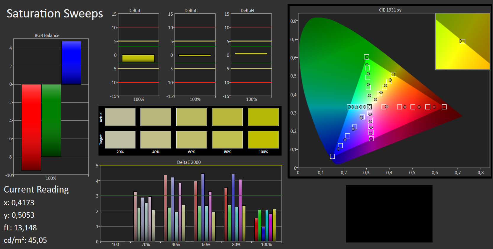 Wer das Helix trotz seiner kleinen Display-Diagonale für die Fotobearbeitung einsetzen möchte, darf sich über eine nahezu unverfälschte Farbdarstellung freuen (Delta E 3,12). Allerdings ist der Farbraum ähnlich eingeschränkt wie bei den meisten Rivalen, sodass professionelle Anwender auf einen externen Monitor angewiesen sind.