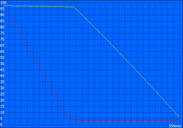 Bei aktiviertem WLAN und angepasster Displayhelligkeit (rund 150 cd/m²) kann der Anwender stattliche 7 Stunden und 18 Minuten im Internet surfen, bis die Reserven des Akkus erschöpft sind. Wer die Anzeige noch etwas stärker dimmt oder gelegentlich ganz ausschaltet, sollte damit problemlos über einen kompletten 8-Stunden-Arbeitstag kommen.