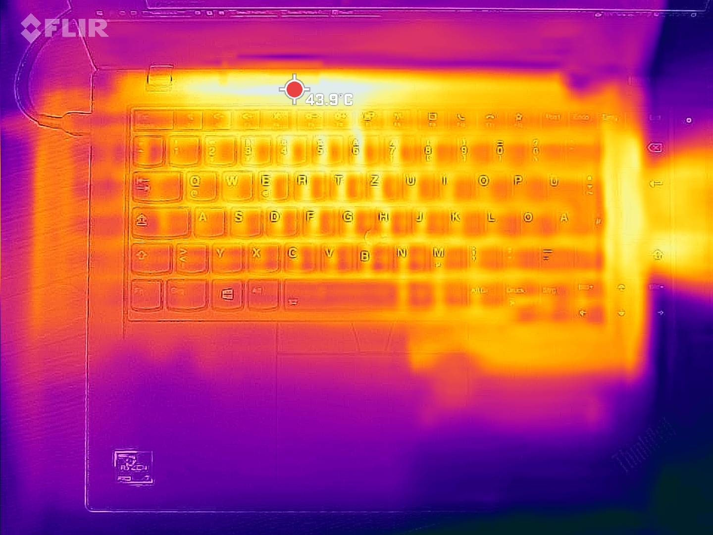 Die Temperaturen an der Außenhülle des Lenovo ThinkPad L14 Gen 2 erreichen maximal 45,2 °C mittig an der Unterseite. Das ist warm, aber nicht kritisch. Die Handballenauflage bleibt immer kühl, sodass man keine schwitzigen Hände beim Arbeiten mit dem Lenovo-Laptop bekommt.