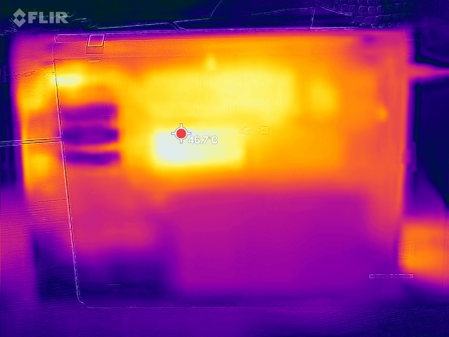 (-) Auf der Unterseite messen wir eine maximalen Wert von 45.2 °C (im Vergleich zum Durchschnitt von 36.8 °C).