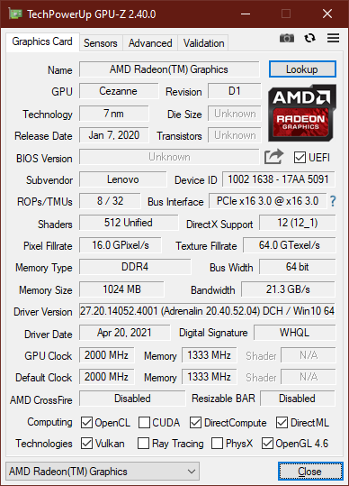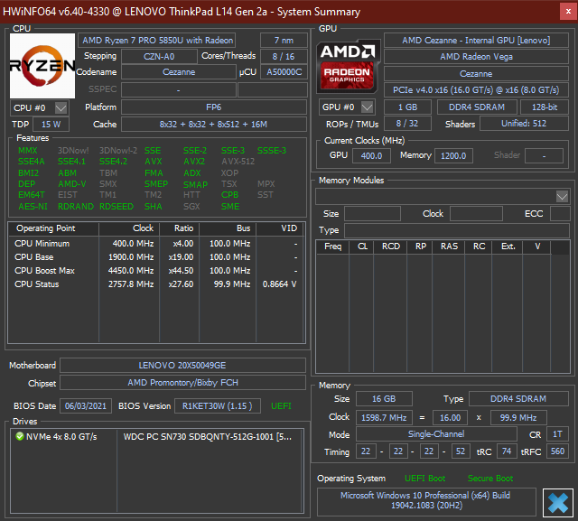 | 86.1 % v7 (old) | 07 / 2021 | Lenovo ThinkPad L14 G2 AMD R7 PRO 5850U, Vega 8 | 1.7 kg | 20.4 mm | 14.00" | 1920x1080 | |