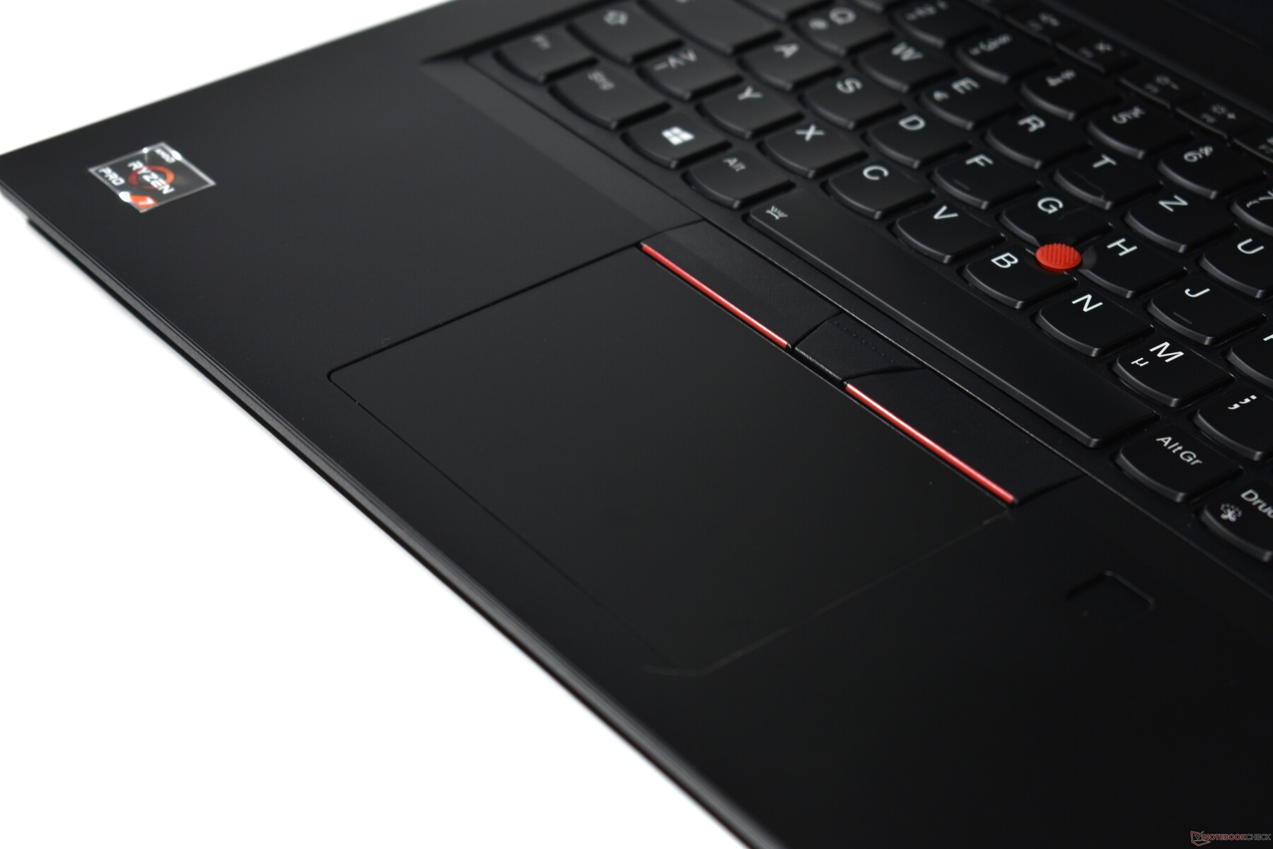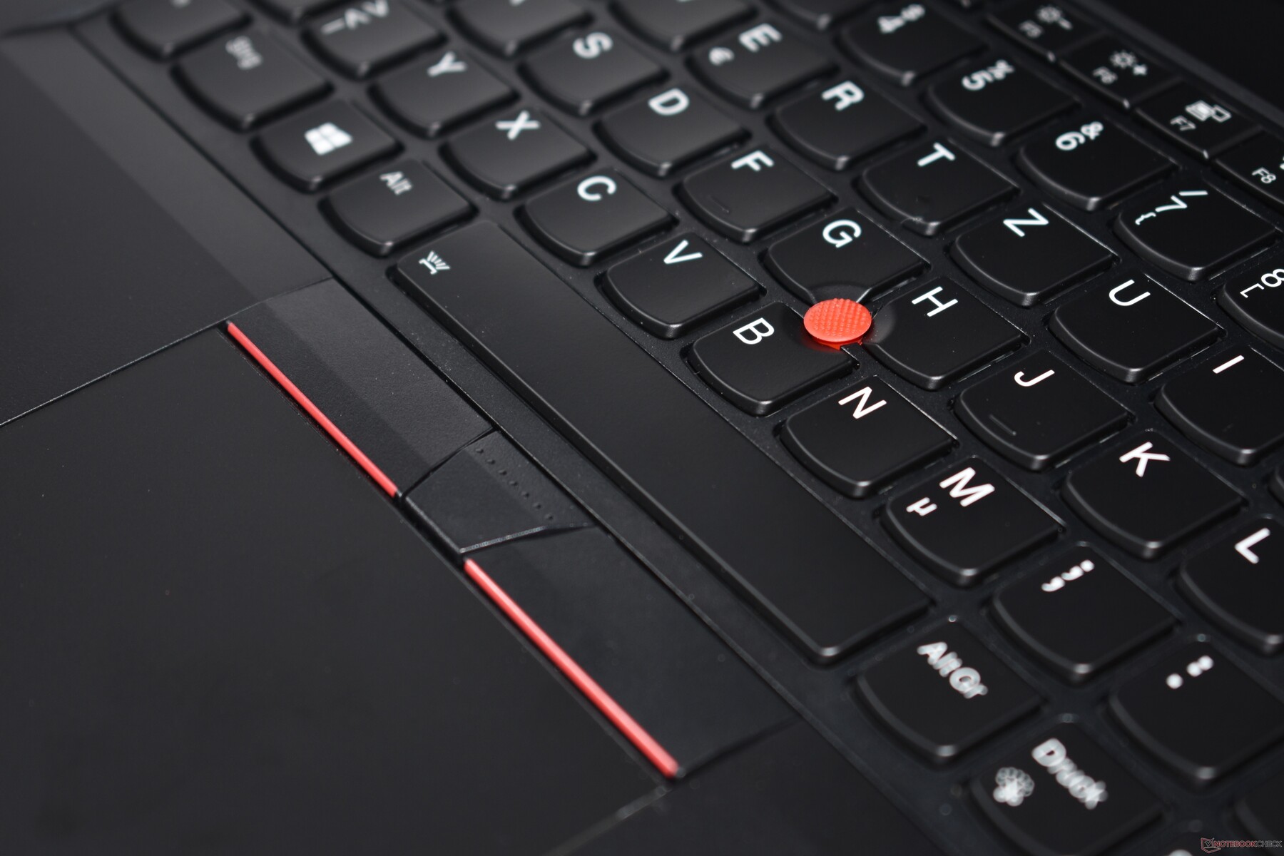 Prominent zwischen den G/H/B-Tasten platziert Lenovo den ikonischen roten TrackPoint. Zu diesem gehören auch die drei Tasten zwischen Touchpad und Tastatur. Mit Druck auf den TrackPoint lässt sich der Mauszeiger präzise und schnell verschieben, ohne, das man die Hände von der Tastatur nehmen muss. Insbesondere für Drag&Drop ist der TrackPoint dem Touchpad überlegen.