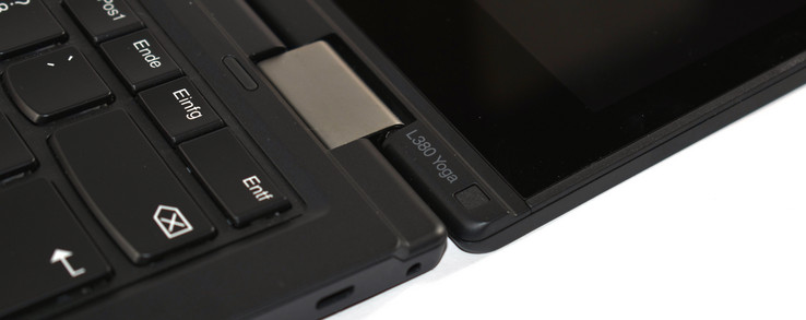 Für ein Business-Laptop ist die Ausstattung mit Sicherheits-Features eher eingeschränkt. Während softwareseitig TPM und Computrace vorhanden sind, gibt es auf der Hardware-Ebene weniger Features als bei anderen ThinkPads. Der Kensington-Lock ist standardmäßig bei allen ThinkPads vorhanden und einen Fingerabdruck-Leser gibt es optional, bei unserem Testgerät ist dieser nicht vorhanden. Genauso optional ist eine Infrarot-Kamera. Nicht angeboten wird das L380 Yoga mit einem Smartkarten-Lesegerät, auch gibt es nicht den praktischen "ThinkShutter", die Kamera-Blende, die Lenovo bei den meisten 2018er-ThinkPads eingeführt hat. Um dieses Feature bei einem Convertible zu bekommen, muss man mindestens zum ThinkPad X1 Yoga greifen.