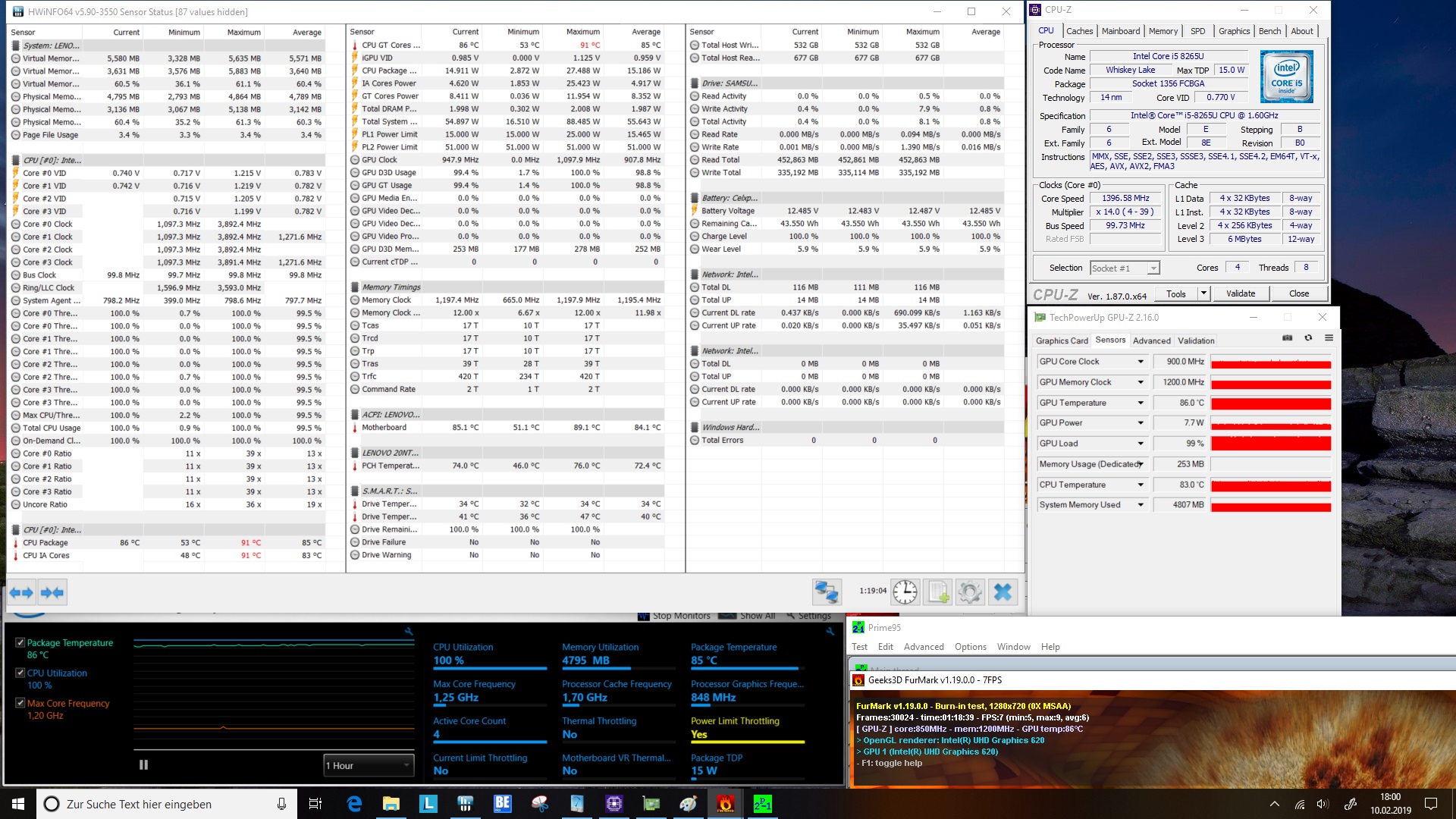 Der Intel Core i5-8265U erhitzte sich beim Stresstest auf maximal 92 °C. Die thermische Grenze scheint der Hersteller bei 90 °C festgelegt zu haben, denn ab dieser Temperatur beginnt bei unserem Testsample das Thermal Throttling. Aber auch das Power Limit von 15 Watt wird fast ständig erreicht. Beim einstündigen Lasttest mit Prime95 taktete der Prozessor trotz der hohen Temperaturen mit 2,4 GHz deutlich über seinem Basistakt (1,6 GHz). Beim Stresstest der GPU verzeichnen wir mit 85 °C ähnlich hohe Temperaturen bei einem stabilen Takt von mindestens 900 MHz. Bei gleichzeitiger Auslastung beider Einheiten (CPU + iGPU) teilen sich beide Komponenten die TDP. An den Temperaturen ändert sich im Vergleich zu den Einzeltests kaum etwas. Allerdings taktet die CPU im Durchschnitt nur noch mit 1,27 GHz. Bei der iGPU hingegen notieren wir mit 900 MHz die gleiche Geschwindigkeit wie zuvor.