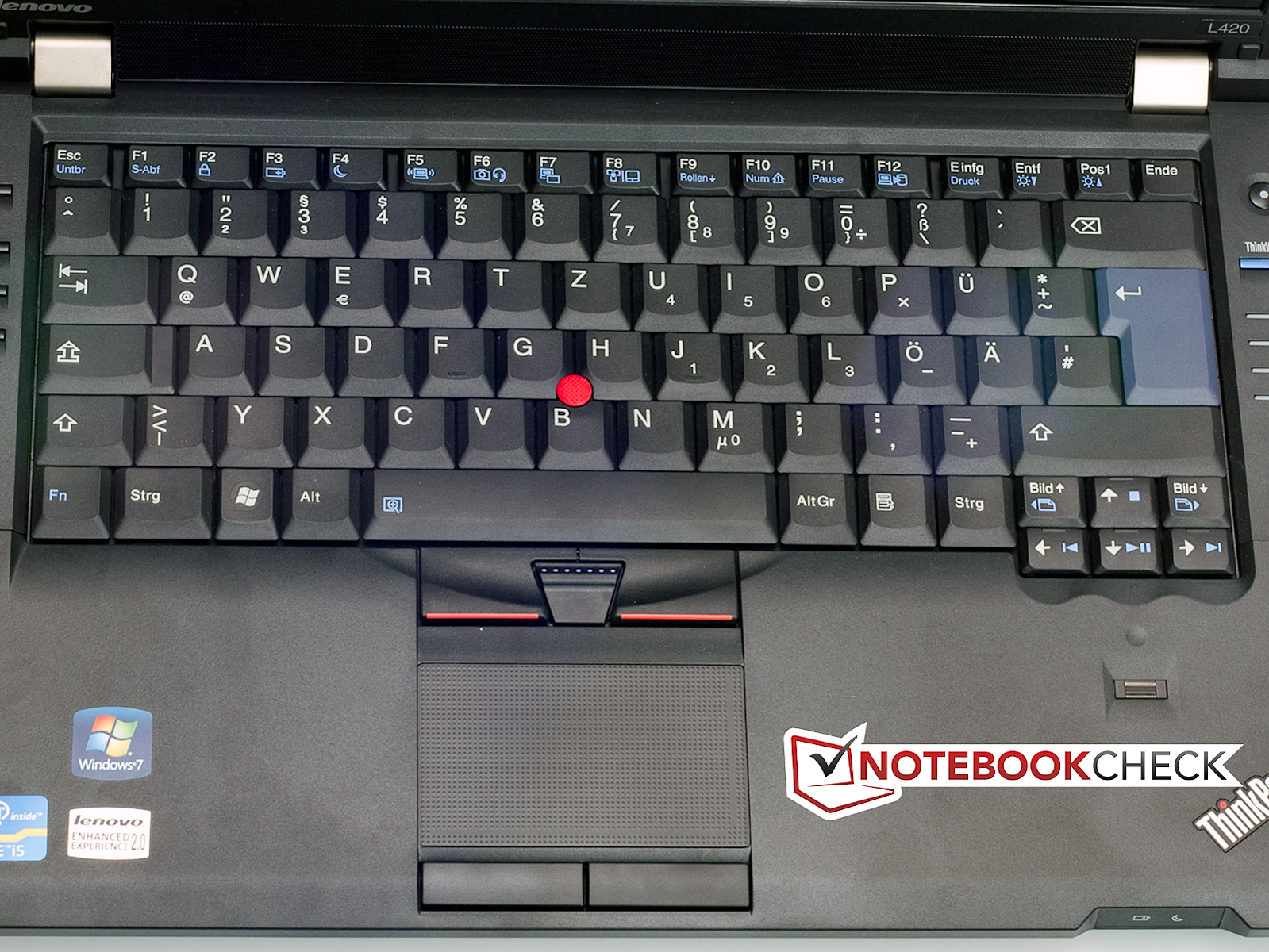 Auf Tastatur und Maus wird bei ThinkPads immer viel Wert gelegt und auch das L420 bildet hier keine Ausnahme. Das 14 Zoll Notebook wird mit 19 x 19 Millimeter großen Tasten ausgeliefert. Das ist für ein Notebook dieser Größe sehr groß, immerhin haben die Tasten die Größe einer normalen Desktoptastatur. Allerdings wurde die große Tastengröße mit dem Verlust des Nummernblocks erkauft. Beim Schreibgefühl kann die Tastatur voll punkten und Vielschreiber werden ihre Freude an der Tastatur haben. Druckpunkt und Hub der Tasten wurde sehr passend gewählt und die konkaven Tasten vermitteln ein angenehmes Schreibgefühl.