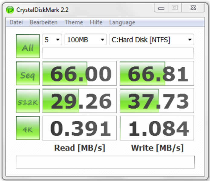 Als Festplatte kommt im Lenovo ThinkPad L420 Notebook ein 2,5 Zoll Modell von Western Digital zum Einsatz. Die WDC WD3200BEVT-08A23T1 besitzt eine (Brutto-) Kapazität von 320 GB und eine Geschwindigkeit von 5.400 Umdrehungen pro Minute. Von den Werten her kann die Festplatte allerdings nicht überzeugen. Eine durchschnittliche Transferrate von 70.2 MB/s sind allenfalls Mittelmaß und auch die maximale Transferrate von 89.1 MB/s lässt zu wünschen übrig. Die Zugriffszeit von 18.9 Millisekunden hingegen ist in Ordnung. Wer sein System sinnvoll aufrüsten möchte, der fängt beim Lenovo ThinkPad L420 vorzugsweise bei der Festplatte an.