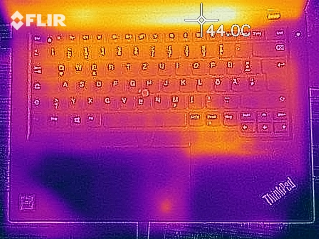 Die Gehäusetemperaturen des Lenovo ThinkPad L480 liegen in einem unkritischen Bereich. Mit 43 °C messen wir den wärmsten Punkt auf der Oberseite der Base. Beim Stresstest erhitzte sich der kleine SoC auf maximal 80 °C. Aber das ist noch kein Grund zur Besorgnis. Vom Thermal Throttling blieb das Lenovo ThinkPad L480 in unserer Testausstattung verschont. Auf die 3D-Leistung hatte die thermische Dauerbelastung keinen negativen Einfluss. Beim erneuten Test mit 3DMark11 erreichte das ThinkPad L480 ein fast identisches Ergebnis im Vergleich zum Kaltstart.