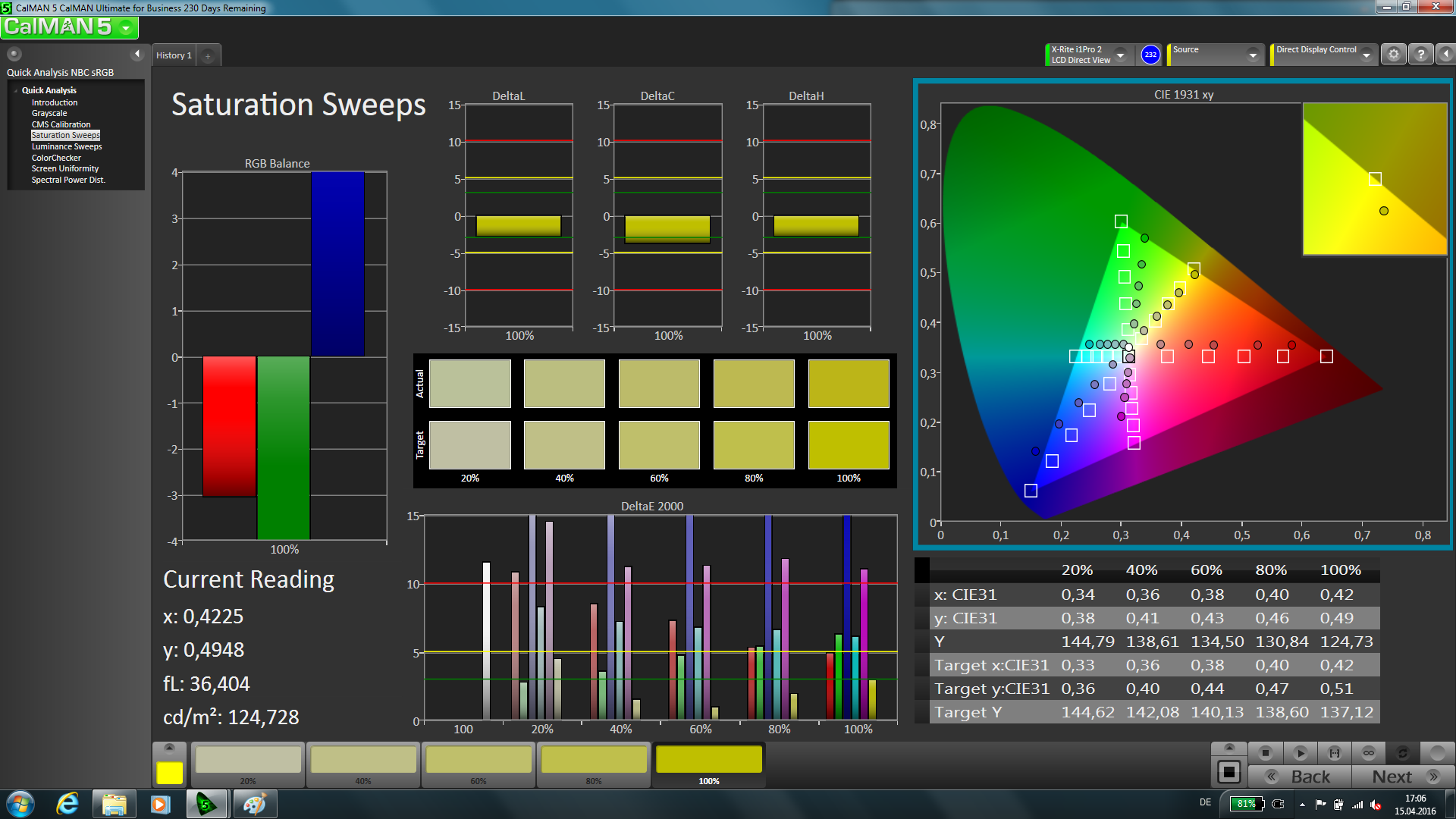 Das LG-Display hat im Auslieferungszustand eine DeltaE-2000-Farbabweichung von 8,49. Ein optimales Ergebnis wäre ein Wert kleiner als 3. Im unkalibrierten Zustand hat das LG-Panel einen leichten Grünstich. Mit Hilfe der Kalibrierung kann für eine Besserung der Werte gesorgt werden. Eine erneute Messung nach der Kalibrierung zeigt nun eine DeltaE-2000-Farbabweichung von 4,66. Damit verfehlt der Wert immer noch den Zielbereich. Bei den Graustufen ist nach der Kalibrierung eine deutliche Verbesserung zu verzeichnen. Die Farbräume AdobeRGB und sRGB können teilweise nicht dargestellt werden. Nur 37,07 % (AdobeRGB) bzw. 57,94 % (sRGB) sind deutlich zu wenig für professionelle Anwendungen.