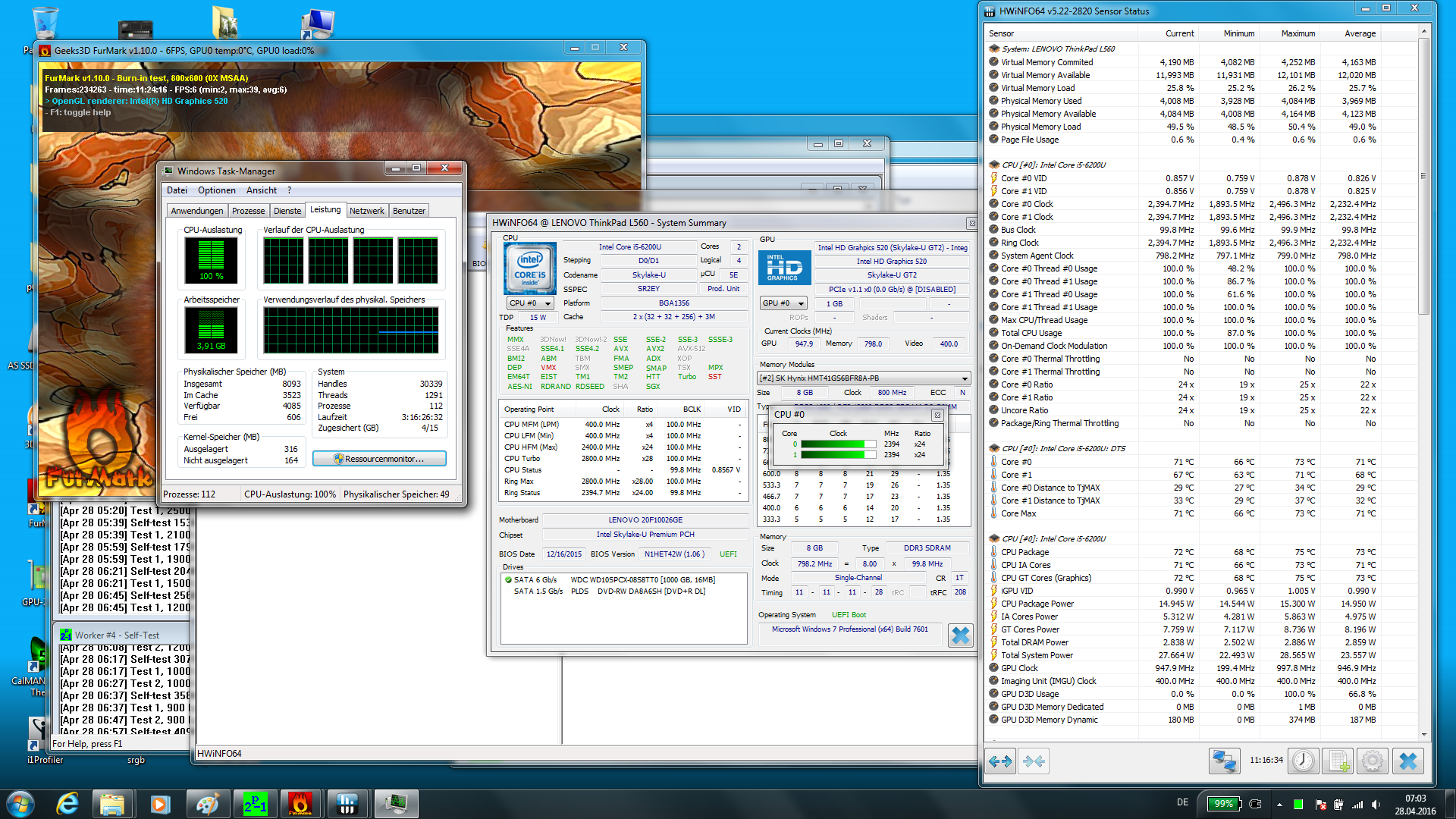 In dem Testgerät, welches wir zur Verfügung gestellt bekommen haben, ist ein Zweikernprozessor von Intel verbaut. Genauer gesagt handelt es sich um einen Intel Core i5-6200U. Nun hält auch in dieser Produktreihe die Skylake-Generation Einzug und sorgt mit einer TDP von 15 Watt für gute Akkulaufzeiten. Beim Vorgängermodell kamen noch Haswell-Modelle der energiehungrigeren Standard-Voltage-Kategorie zum Einsatz. Der Grundtakt der CPU liegt bei 2,3 GHz. Dieser kann im Turbo-Modus auf 2,8 GHz (1 Kern) bzw. 2,7 GHz (2 Kerne) erhöht werden. Vergleicht man die Cinebench R15 Werte mit dem ThinkPad L540, so ist zu erkennen, dass die Leistung 4 respektive 9 % hinter dem Intel Core i5-4200M liegt. Ein Ergebnis, welches durch niedrigere Taktraten des 6200U zustande kommt.