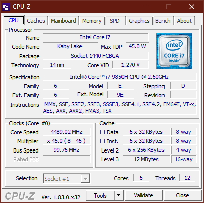 Der Intel Core i7-9850H ist der leistungsstärkste mobile i7-Prozessor der aktuellen "Coffee-Lake-Refresh"-Generation, die Intel als "9. Generation der Core-i-CPUs" vermarktet. Die vier Kerne dieses 45-Watt-Prozessors sind weiterhin in der 14++-Nanometer-Fertigungsweise hergestellt und sie takten mit 2,6 bis 4,6 GHz. Vergleiche mit anderen Prozessoren sind mit unserer CPU-Benchmarkliste möglich.