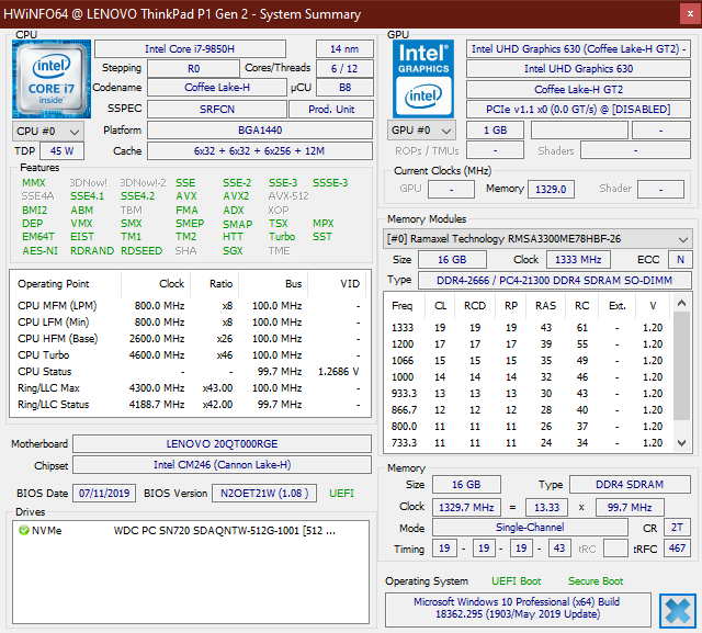 Wir testen diesen Prozessor erstmalig im Lenovo ThinkPad P1 2019. Leider kann er sein Potenzial nicht ausreizen. Im Cinebench-Multicore-Test kann der ThinkPad-Laptop zwar kurzzeitig über 70 Watt verbrauchen, doch schon nach wenigen Sekunden sinkt der Verbrauch auf die nominale TDP von 45 Watt. Nicht mal diesen Wert kann das System allerdings auf Dauer halten. In der Cinebench-Schleife fällt der Verbrauch schnell in den Bereich um 30 Watt, wodurch die Taktrate bei nur etwa 2,6 GHz liegt. Zwar erholt sich das System im Verlauf des Cinebench-Last-Tests etwas, was in einer zeitweisen Steigerung der Taktrate auf rund 2,8 bis 3 GHz resultiert, aber die Leistungsentfaltung des Prozessors ist insgesamt nicht gut. Dabei ist zu beachten, dass die BIOS-Version ab Werk eine noch instabilere Performance ablieferte. Nachdem alle Treiber und das BIOS auf den neuesten Stand (Version 1.08 zum Zeitpunkt des Tests) gebracht waren, stabilisierte sich die CPU-Leistung etwas.