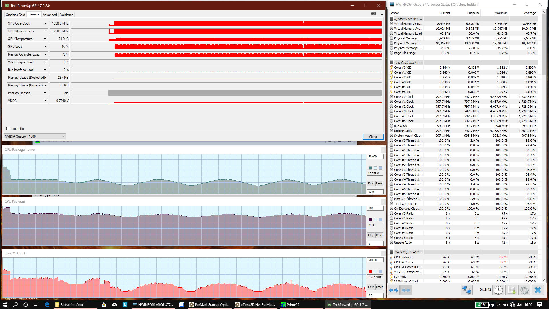 Im Stresstest mit Prime95 und FurMark kann das Lenovo ThinkPad P1 2019 zunächst eine CPU-Taktrate von 3,4 GHz auf allen sechs Kernen erreichen, wodurch der Verbrauch des Prozessors bei 55 Watt liegt. Nach wenigen Sekunden steigen die CPU-Temperaturen allerdings schon auf 97 °C, sodass die CPU ihre Taktraten und den Verbrauch senken muss. Nach 10 Minuten Stresstest schwanken die Taktraten zwischen 800 MHz und 1,9 GHz, womit der Verbrauch zwischen 17 und 30 Watt liegt. In diesem Zustand verbleibt die CPU, wobei die Temperaturen maximal 75 °C erreichen. Im Gegensatz zum Hauptprozessor muss die GPU ihre Taktrate zu keinem Zeitpunkt reduzieren.