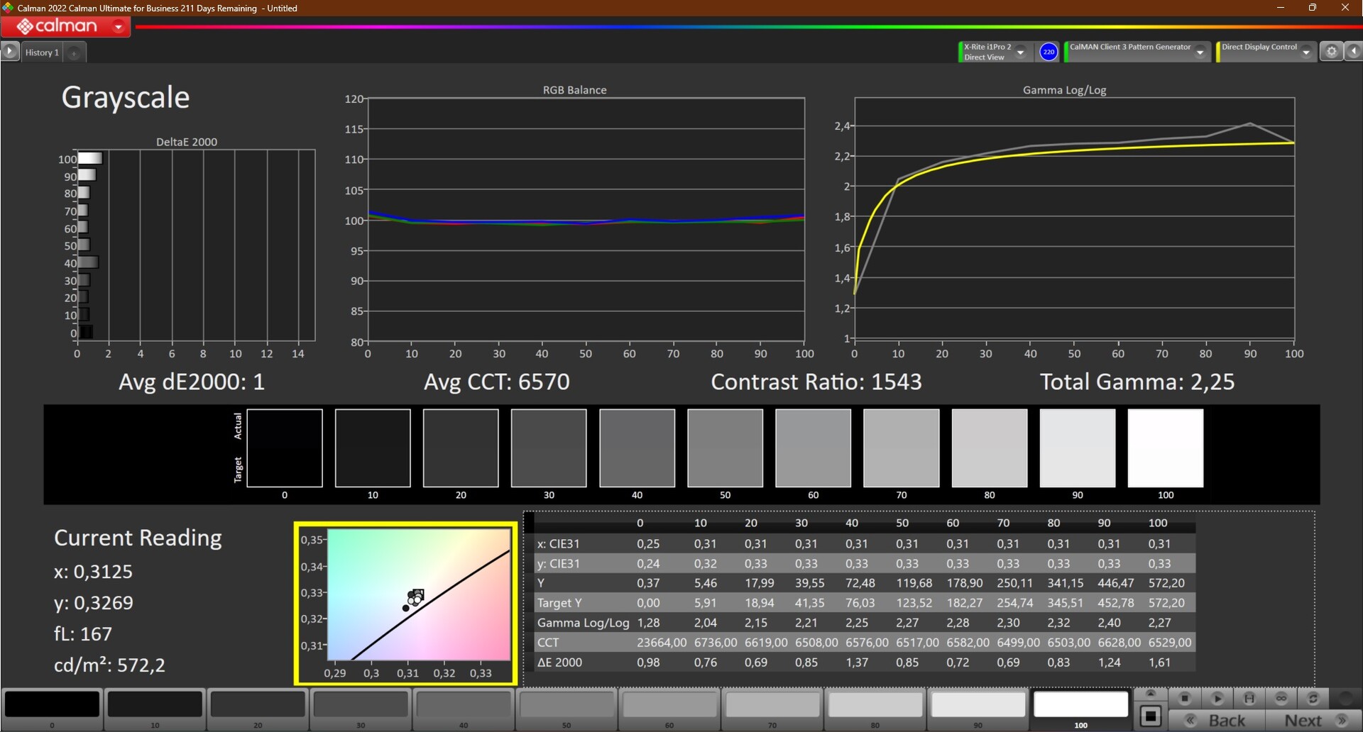 Ab Werk sind besonders die mit CalMan gemessenen Abweichungen bei den Graustufen stark, was durch den hohen deltaE-Wert bei den Graustufen deutlich wird. Nach einer Kalibrierung mit dem X-Rite i1Pro 2 Colorimeter und dem X-Rite i1Profiler lag der deltaE-Wert bei insgesamt bei einem durchschnittlichen Wert von 1, ein sehr gutes Ergebnis.