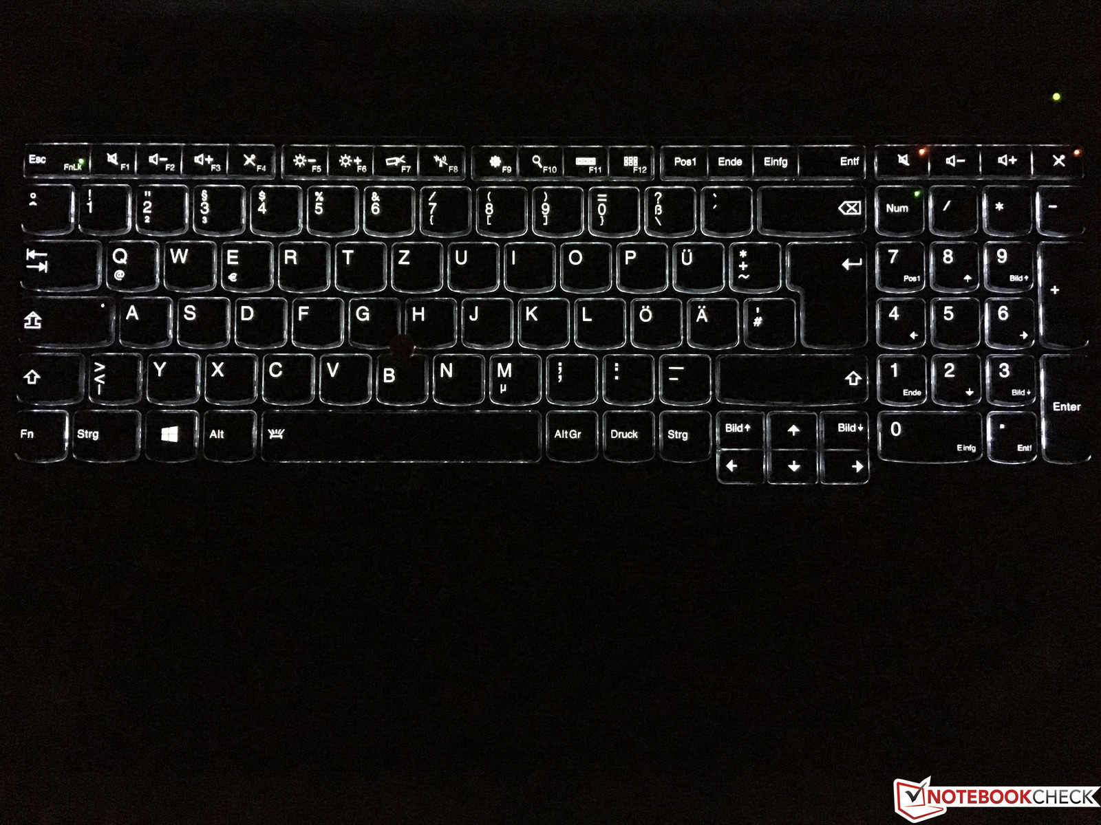 Die 6-reihige Chiclet-Tastatur ist mit einer zweistufigen weißen Hintergrundbeleuchtung ausgestattet, die aber je nach Sitzposition etwas blenden kann. Auch die Intensität dürfte für unseren Geschmack noch etwas höher ausfallen. Die Tasten selbst sind leicht abgerundet und konkav, zudem gibt es einen dedizierten Nummernblock. Das Layout ist wie gewohnt ein wenig verändert, die auffälligste Eigenschaft sind sicherlich die vertauschten FN- und Strg-Tasten. Daran muss man sich als ThinkPad Neuling erst einmal gewöhnen, oder man ändert die Belegung im BIOS einfach. Die obere Reihe der Funktionstasten ist etwas kleiner ausgeführt, und standardmäßig sind die Sekundärfunktionen wie beispielsweise die Helligkeitsregelung aktiv. Das ist bei einer Workstation ein wenig merkwürdig, kann aber durch die Funktion Fn-Lock (Fn + Esc) umgestellt werden. Oberhalb des Nummernblocks lässt sich, wie schon bei den Tasten F1-F4, die Lautstärke bzw. das Mikrofon regeln. Hier hätte man sicherlich andere Funktionen implementieren oder dem Nutzer beispielsweise vier frei programmierbare Makrotasten bieten können. Die Tastatur ist nun wieder mit mehr Status-LEDs ausgerüstet, wie es die vorherigen Generationen waren (z. B. ThinkPad W550s).