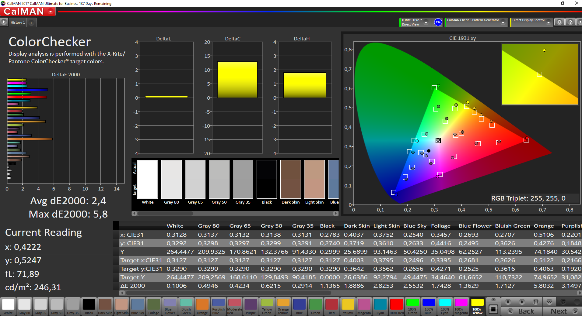 | Delta E Colorchecker * | 4.5 | 2.35 48% | 2.7 40% | 4.5 -0% | 4.14 8% | 6.7 -49% | 4.2 7% | 2.6 42% |