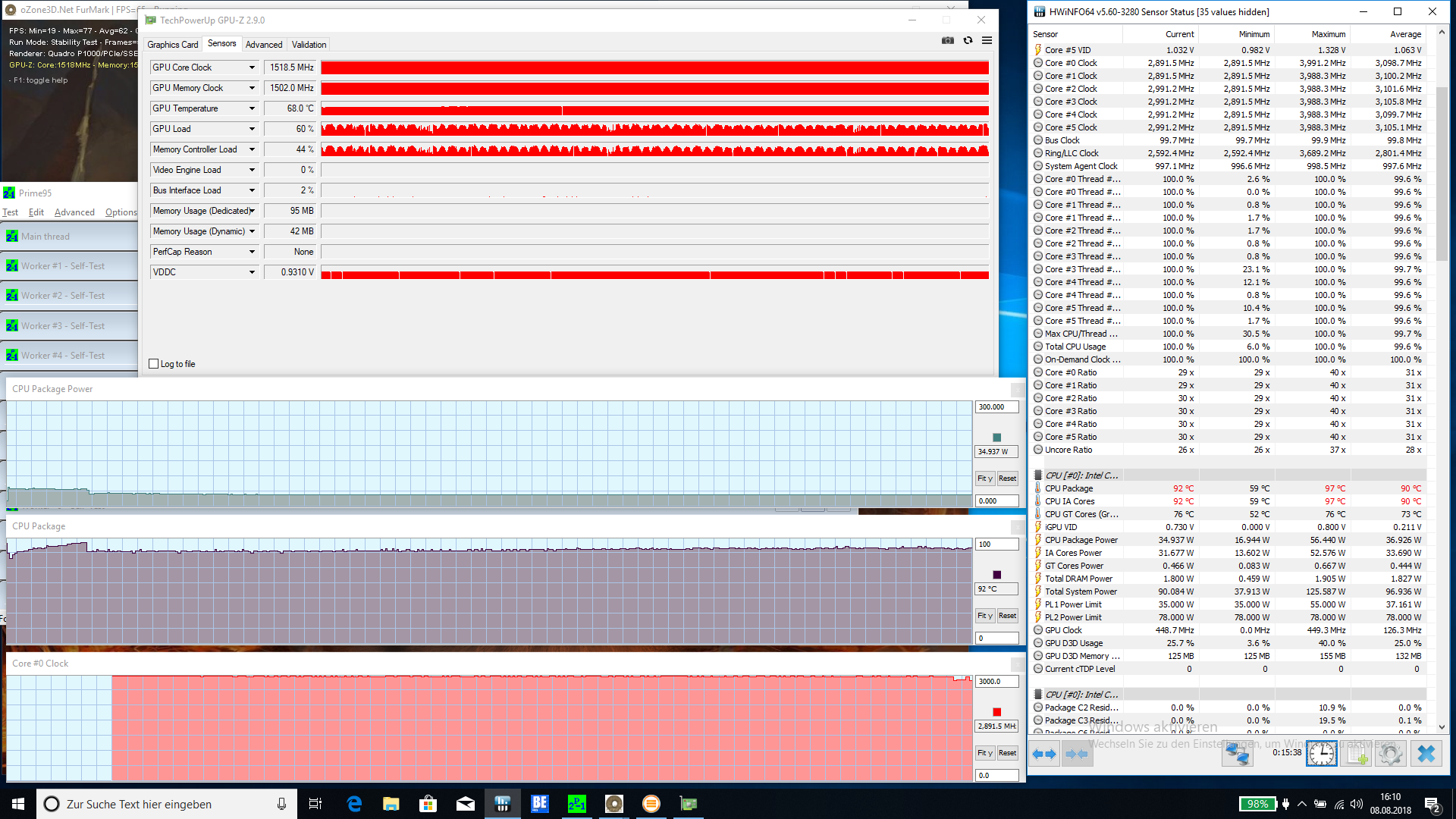 Der Stresstest mit Prime95 und FurMark simuliert eine extreme Last, sowohl CPU als auch GPU sind zu 100 % ausgelastet – hierbei kommt das Kühlsystem des ThinkPad P52 an seine Grenzen. Anfänglich kann der Prozessor mit 3,6 GHz arbeiten und dabei 56 Watt verbrauchen, doch die Temperaturen an der CPU steigen auch schnell auf 97 °C. Deshalb drosselt Lenovo die CPU nach einer Minute ein wenig, statt 56 Watt kann sie nur noch 35 Watt verbrauchen, die Taktrate liegt bei etwa 3,2 GHz. Die Temperaturen schwanken dabei für die nächsten 10 Minuten um die 90-°C-Marke – danach sinkt der Takt schwankend weiter ein wenig ab, die sechs Prozessorkerne arbeiten nunmehr nur noch mit 2,8 bis 3,1 GHz. Auf Dauer steigen die Temperaturen am Prozessor auch wieder auf 95 °C an.