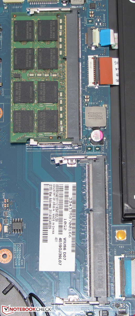 Im Gegensatz zum S531 ist das S540 mit zwei Arbeitsspeicherbänken ausgestattet. Eine der Bänke ist mit einem Acht-Gigabyte-Modul belegt. Ein Tausch der Festplatte lässt sich einfach bewerkstelligen. Es können dabei 2,5-Zoll-Festplatten der Bauhöhen 7 und 9,5 mm benutzt werden. Das Thinkpad ist mit einem M.2-Steckplatz bestückt, der einen SSD-Cache beherbergt. Der Cache könnte durch ein Modell mit mehr Speicherplatz ersetzt werden und dieses dann als Systemlaufwerk dienen. Entsprechende SSDs sind aber noch schwer zu bekommen.